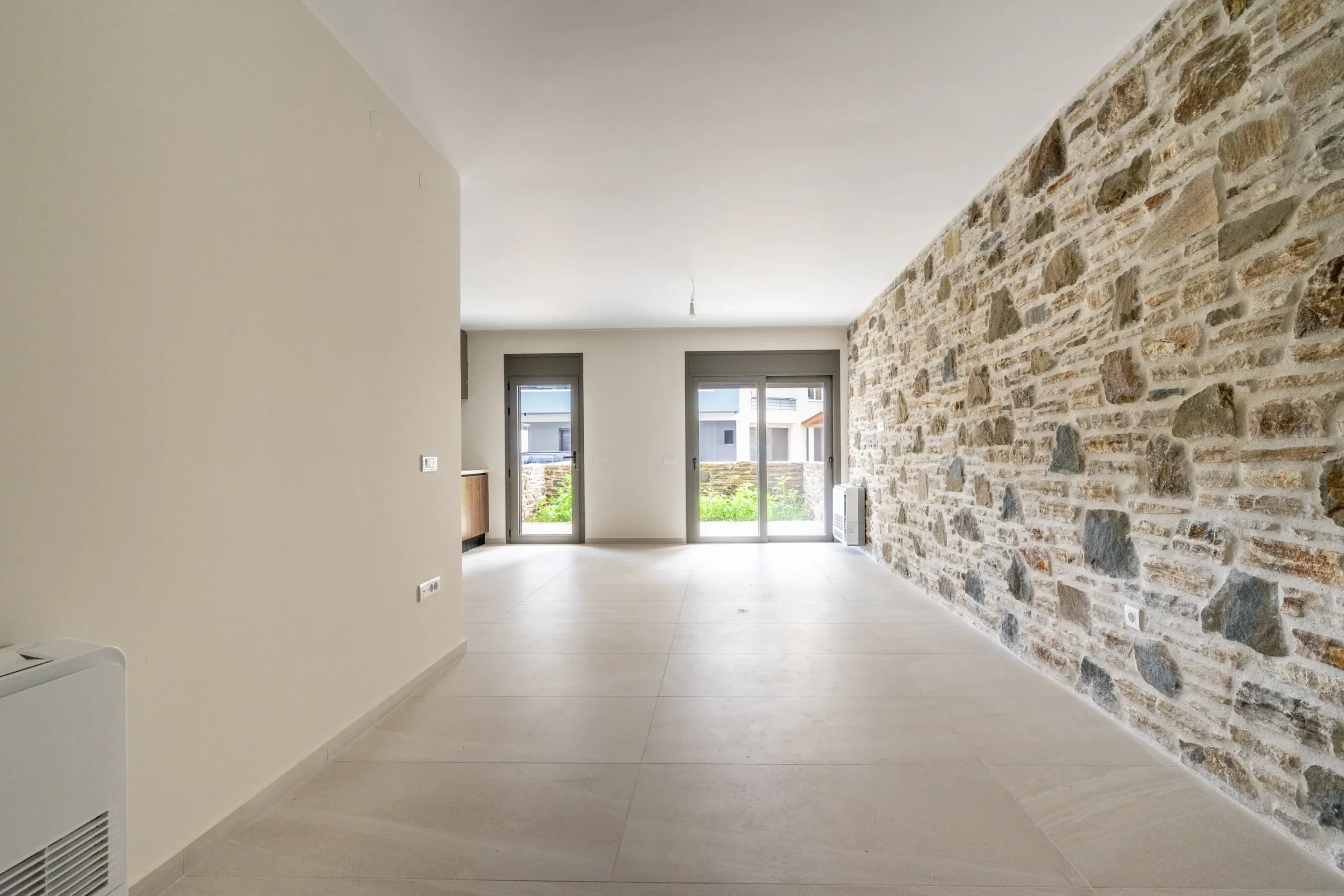 The proportions of the living area and the dual terrace access create an airy, open atmosphere, making the space feel larger and well balanced.