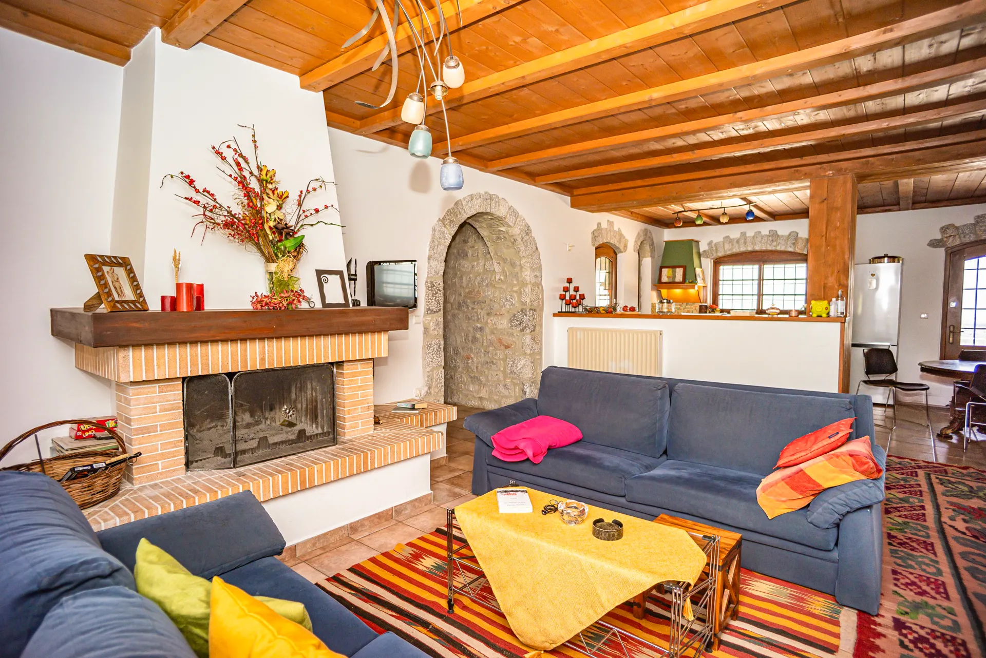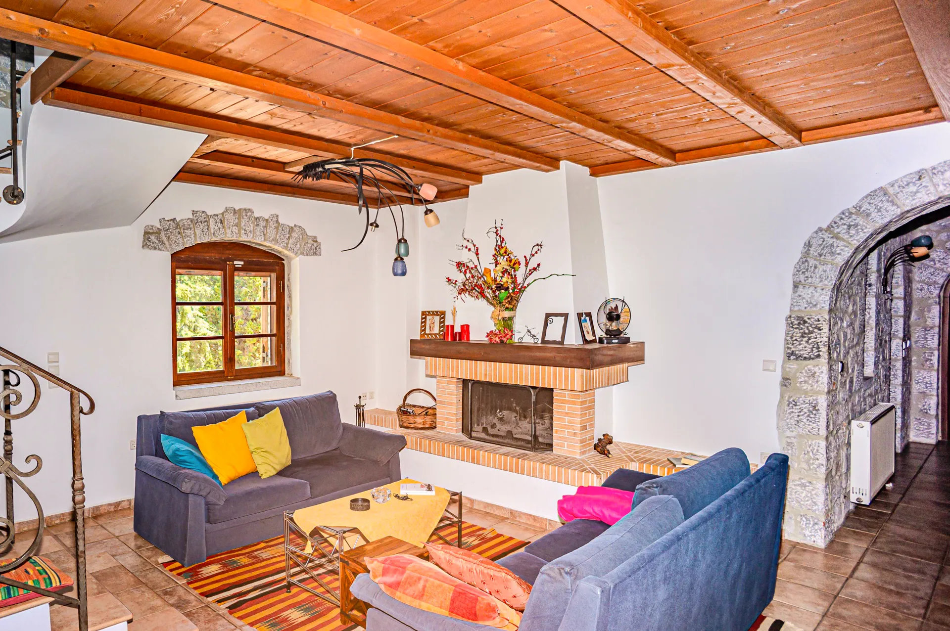 Inside, the layout is both spacious and practical. The home includes three bedrooms, one of which is a master suite with a private bathroom, along with three full bathrooms and an additional guest WC. Two separate living areas offer flexibility for everyday living or hosting guests, while the kitchen is positioned to serve the main living spaces comfortably. High quality tiled flooring, wooden double glazed window frames, and three fireplaces contribute warmth and character to the interior, while autonomous heating and generous storage areas ensure the property remains comfortable throughout the year.