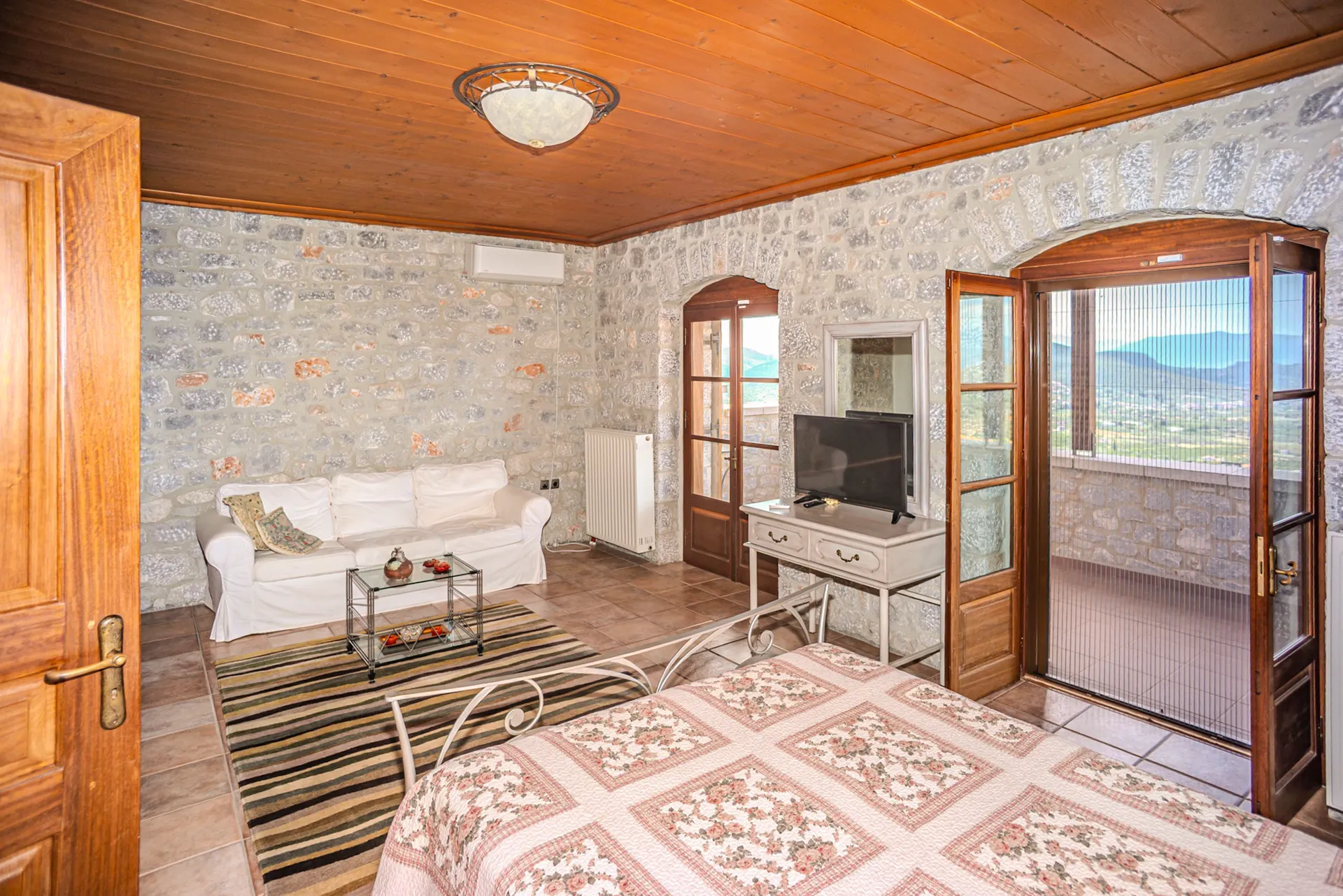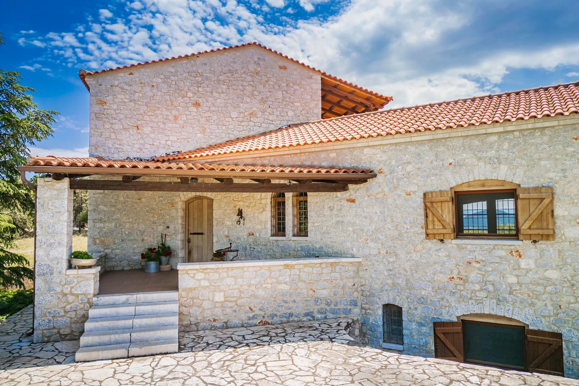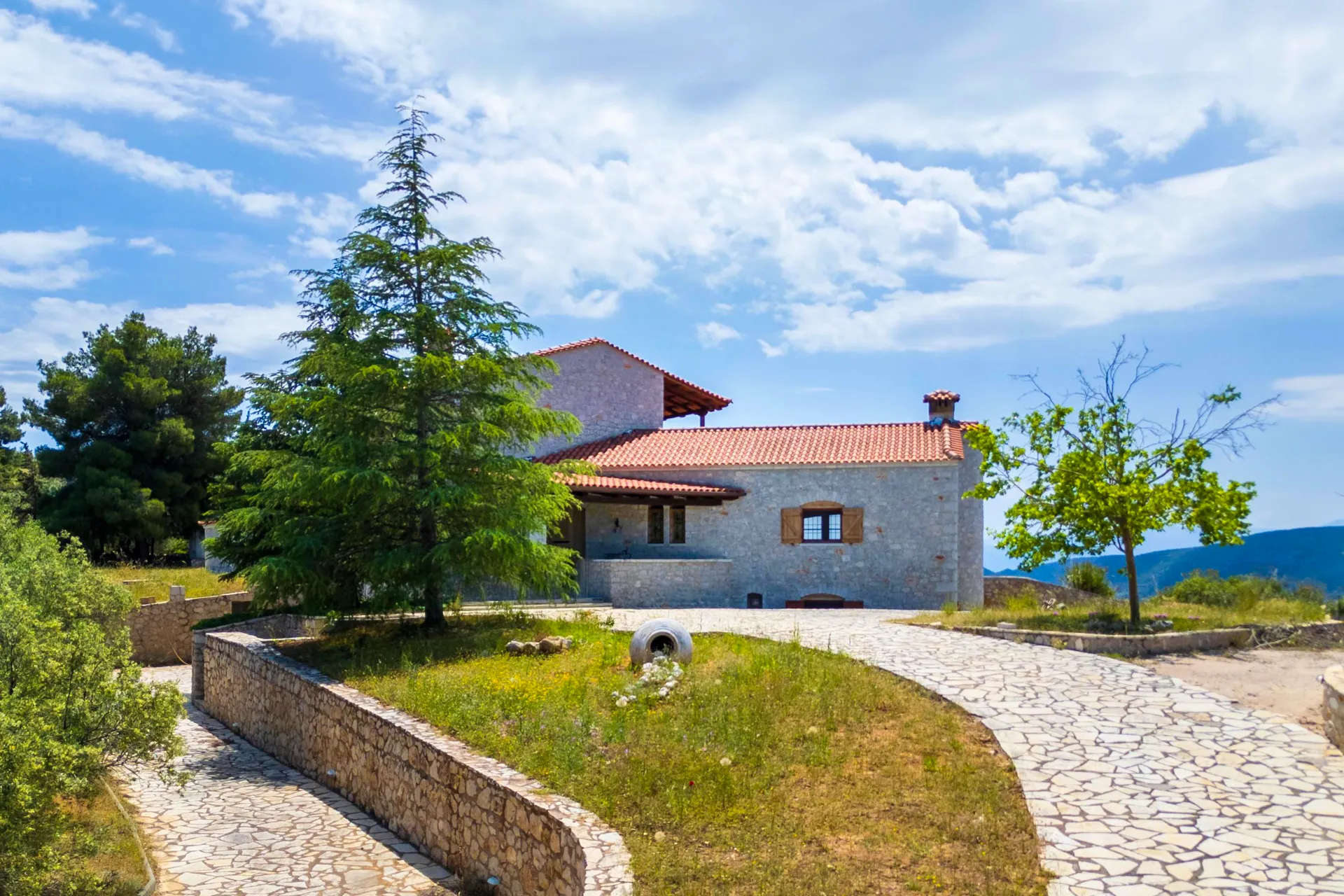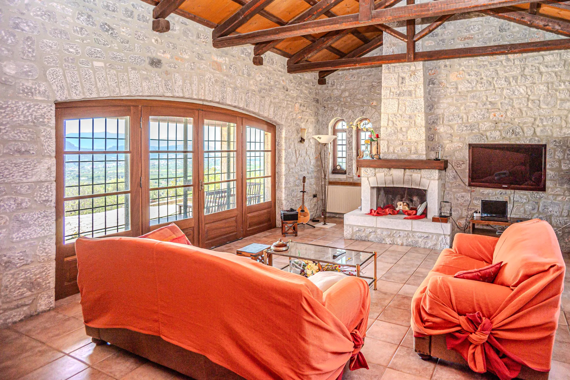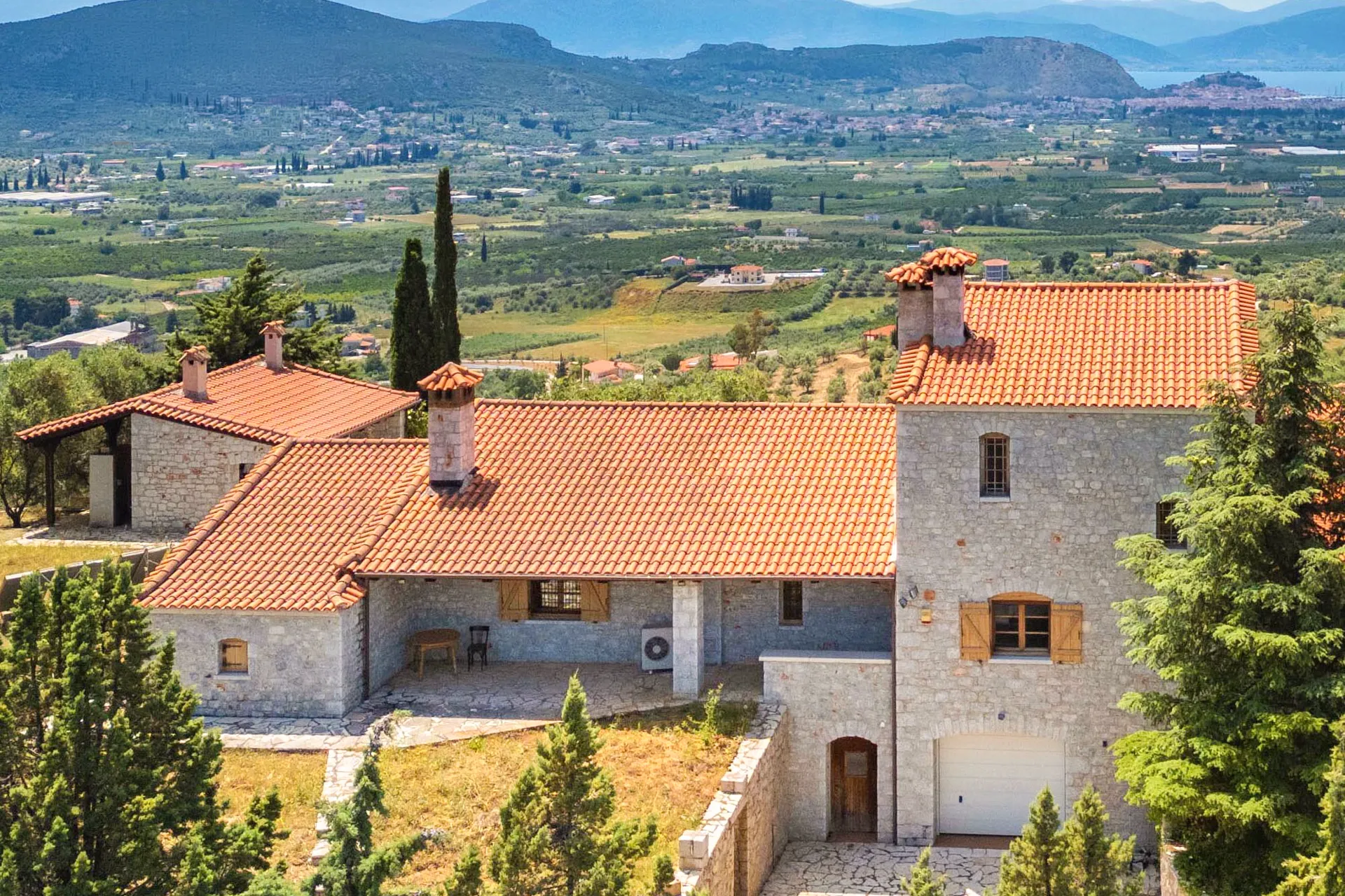 The residence extends across three levels, including a semi basement, ground floor, and first floor, with a total interior area of 420 sq.m. Constructed in traditional stone, the architecture blends naturally with the environment, creating a home that feels grounded in the landscape. Large openings allow natural light to move through the interiors while framing distant views towards Nafplio and the surrounding mountains.