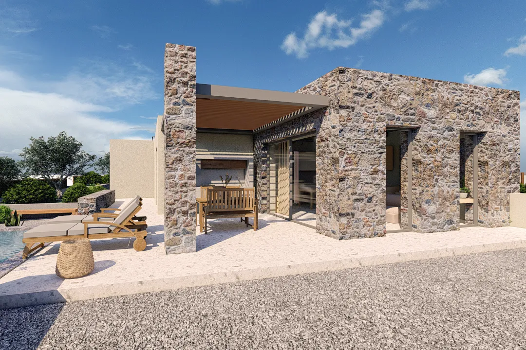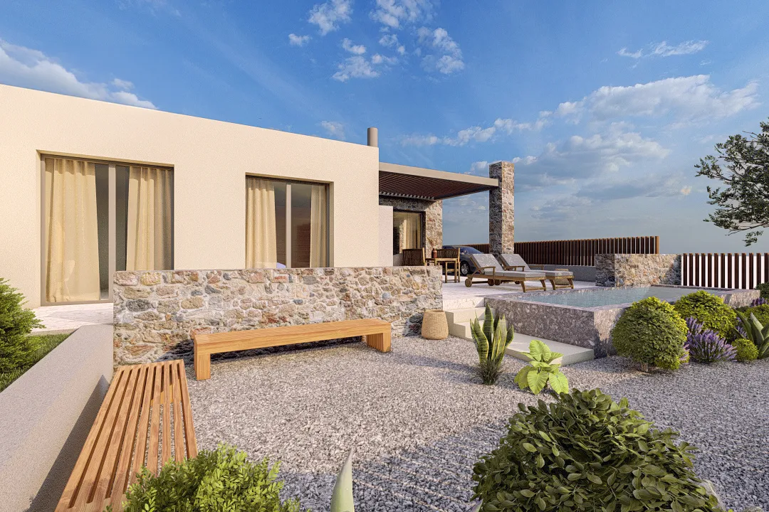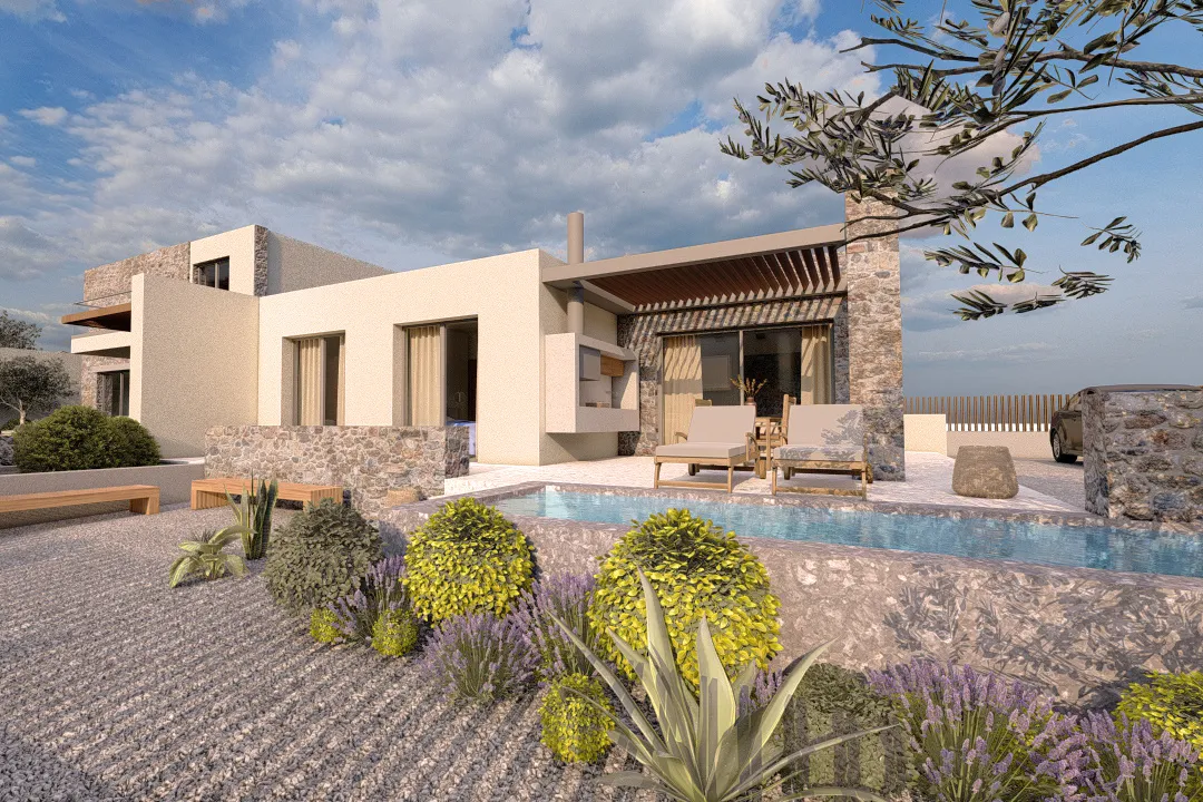 The architecture combines clean modern lines with natural materials such as stone and wood, integrating seamlessly into the surrounding landscape. Large windows bring in natural light and highlight views toward Tolo and the surrounding green hills. Energy-efficient systems provide eco-friendly living while maintaining contemporary standards of style and comfort. A private pool can be included as an optional feature, offering a touch of luxury to the property.