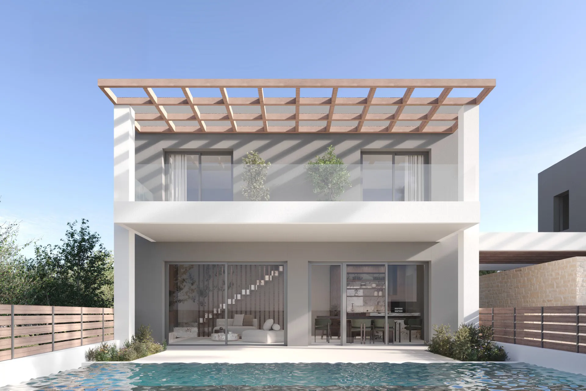 This under-construction modern villa for sale in Kantia spans 100 sq.m. of thoughtfully designed living space, combining contemporary comfort with practical elegance. The ground floor opens into a bright, open-plan area where the living room, dining space, and kitchen flow seamlessly. Large windows frame views of the private garden, filling the interior with natural light. A convenient guest WC completes the ground level.