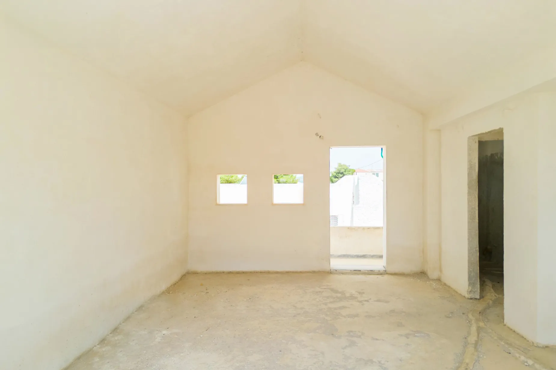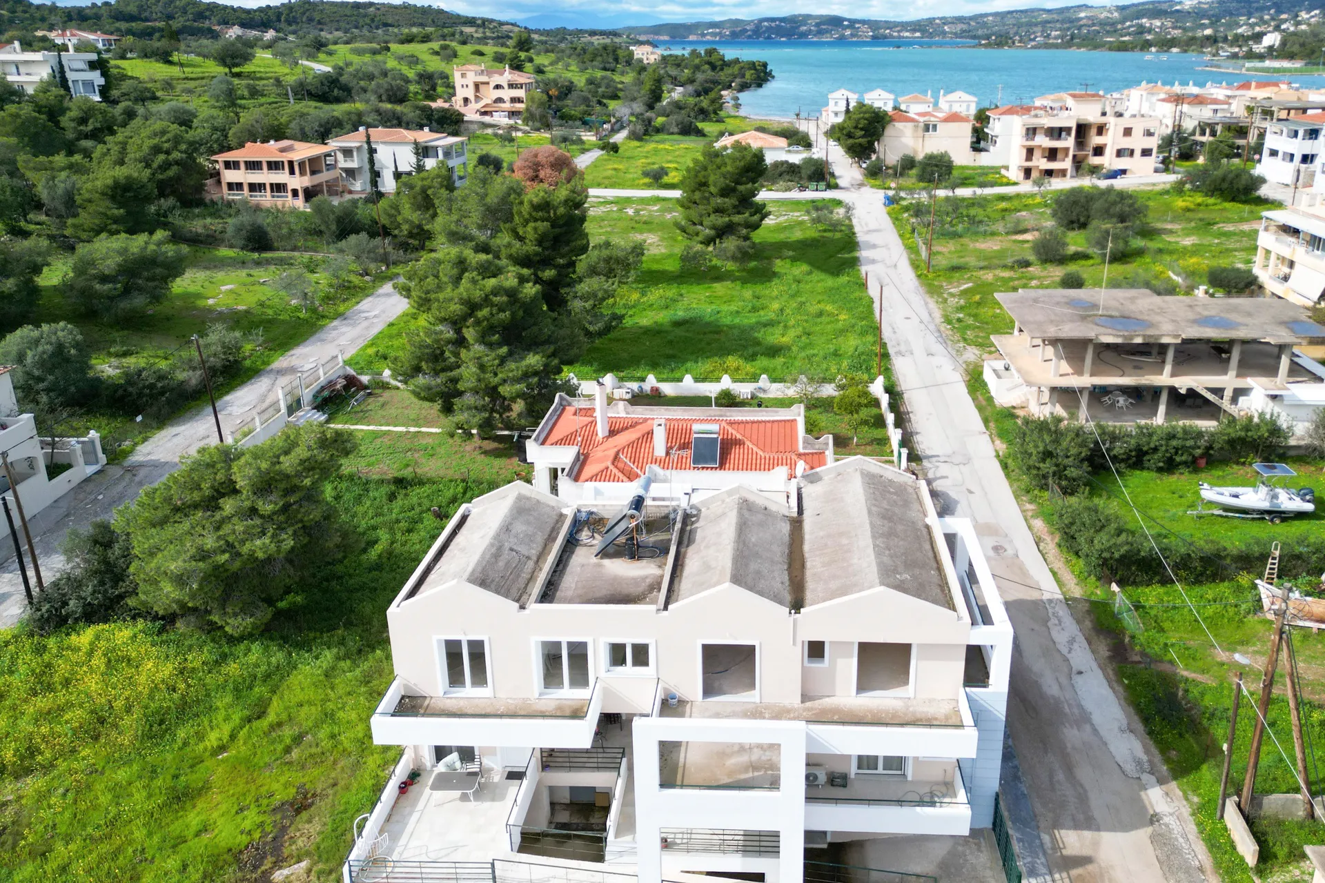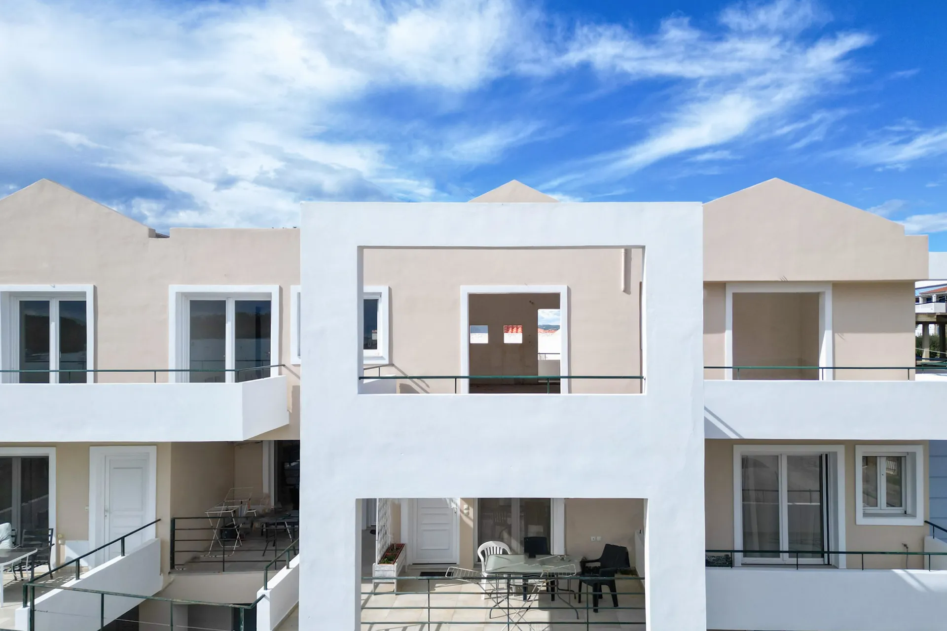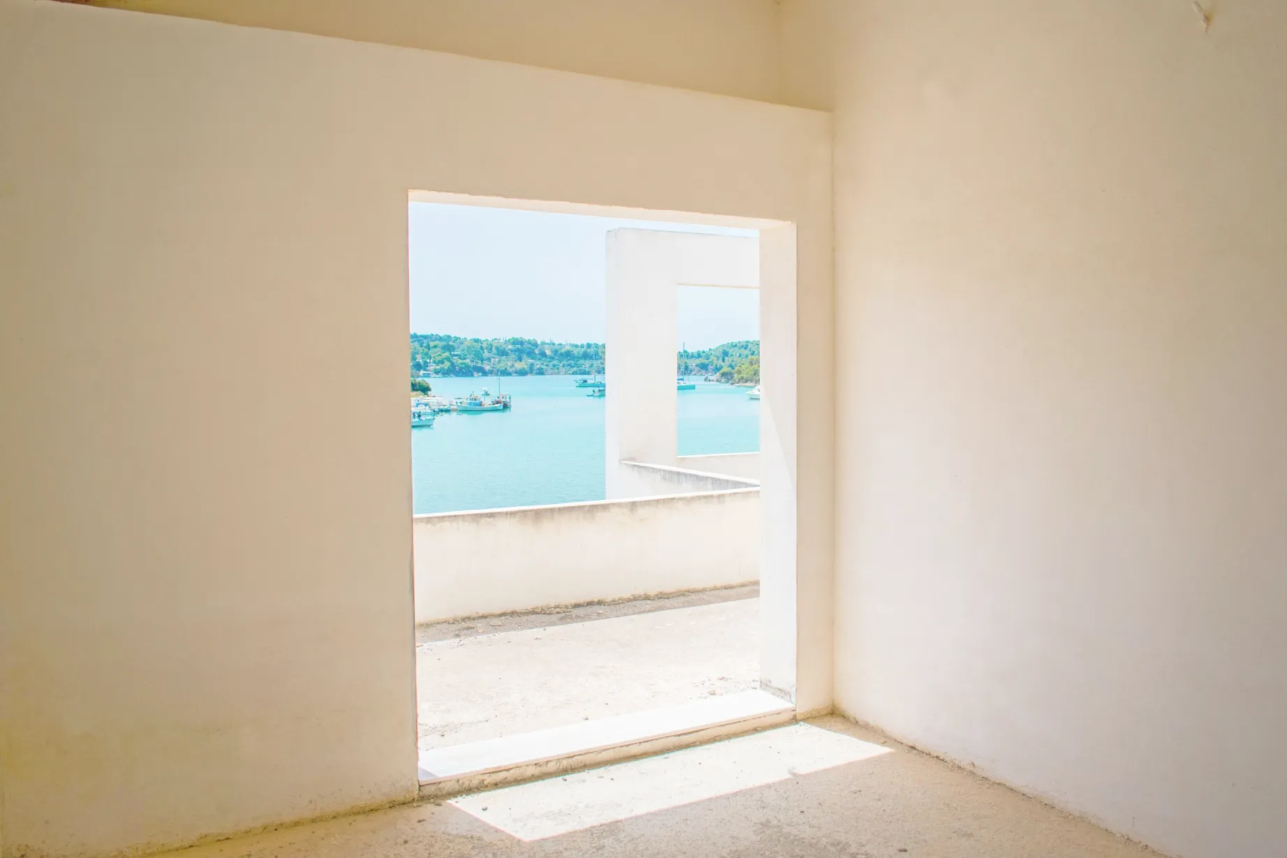 At the top of the building, the first floor hosts two apartments that enjoy open views toward the bay. The larger unit of 85 sqm remains at the structural stage and is designed to include an open-plan kitchen and living area, two bedrooms, a bathroom with the option for an additional WC, and expansive balconies totaling 45 sqm. These generous outdoor spaces create a natural extension of the living area and frame wide views across the surrounding landscape and the sea. Adjacent to it, a second apartment of 65 sqm has already reached a more advanced stage of construction, with masonry, doors, and windows installed. The layout is designed around an open-plan kitchen and living room, two quiet bedrooms, and a modern bathroom. From the 12 sqm southeast-facing balcony, both the living room and one bedroom open toward views of the bay.