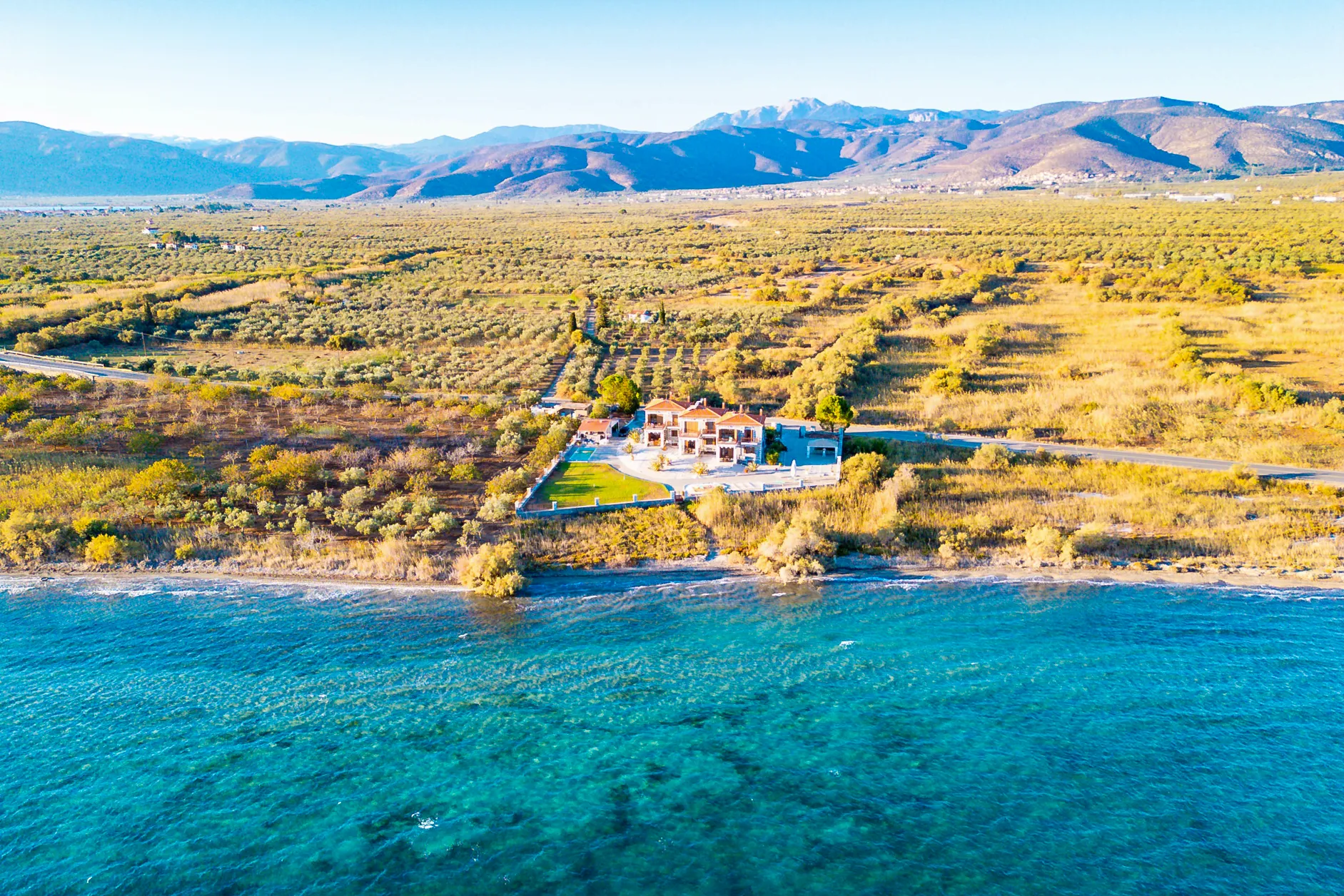 The Sea Front Complex in Paralio Astros benefits from direct sea frontage along the Argolic Gulf in the wider region of North Kynouria within the Peloponnese. The positioning of the structures allows for uninterrupted sea views from all principal rooms and outdoor areas, supported by private swimming pools and landscaped outdoor spaces integrated into the site.