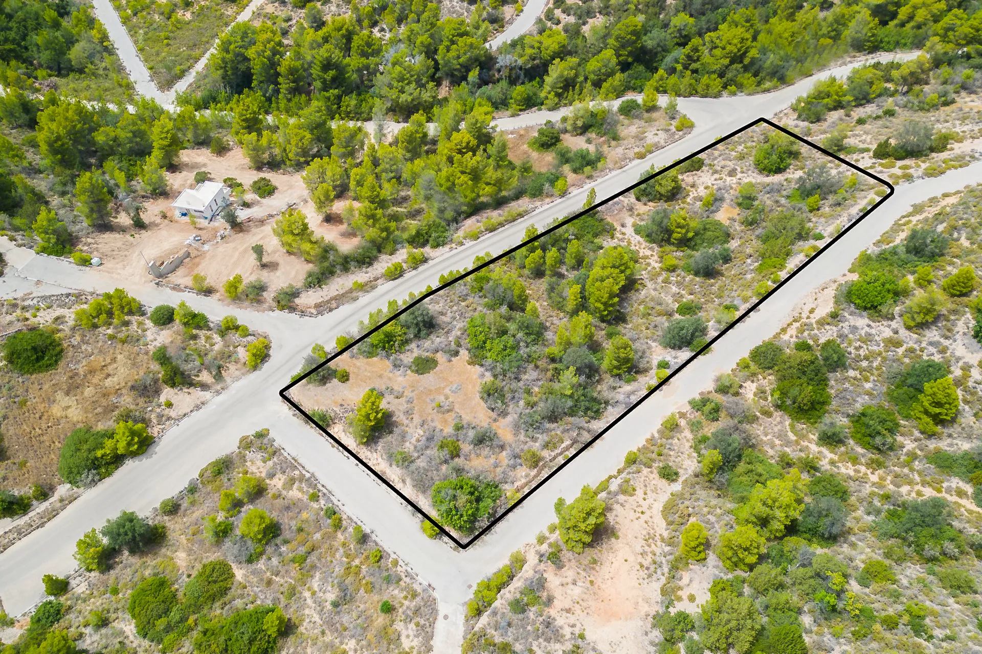 In Ververonda, Porto Cheli, within a pine forest setting, the Sea View Plot in Porto Cheli presents a 752 sq.m. parcel with dual road frontage and a building capacity of 240 sq.m. The Sea View Plot in Porto Cheli is positioned with a south facing orientation, offering views toward the sea and the surrounding pine forest.