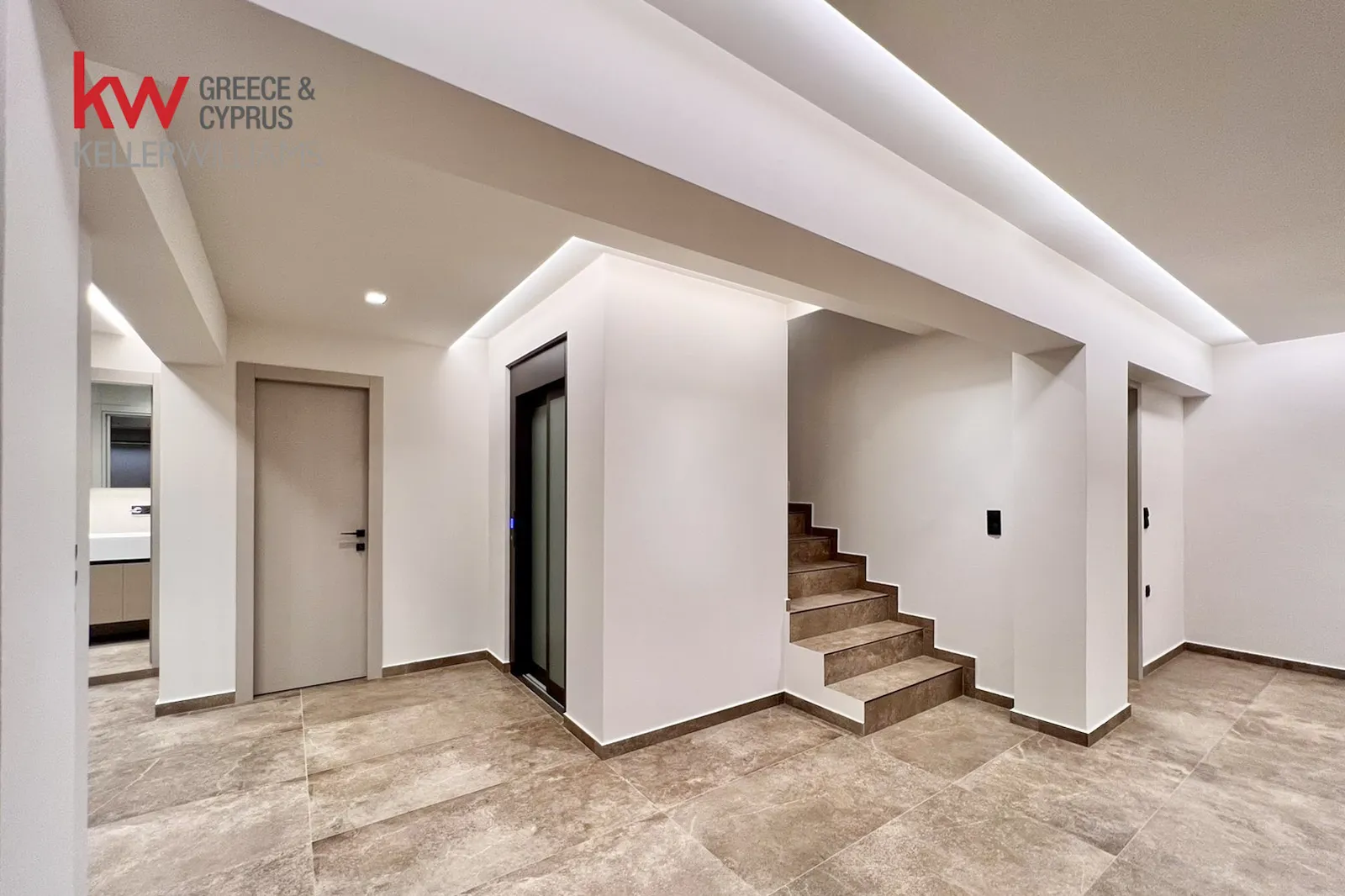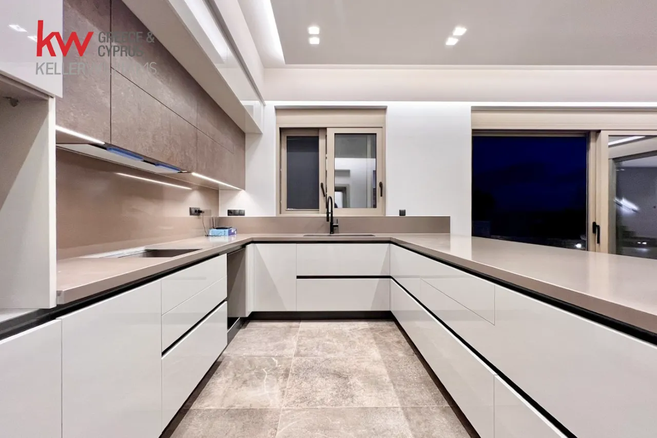 On the upper level, three spacious master bedrooms each feature their own bathroom, along with a kitchenette serving the floor. All bedrooms enjoy privacy and open views, reinforcing the calm and elevated atmosphere that defines this sea view villa for sale in Kalamata.