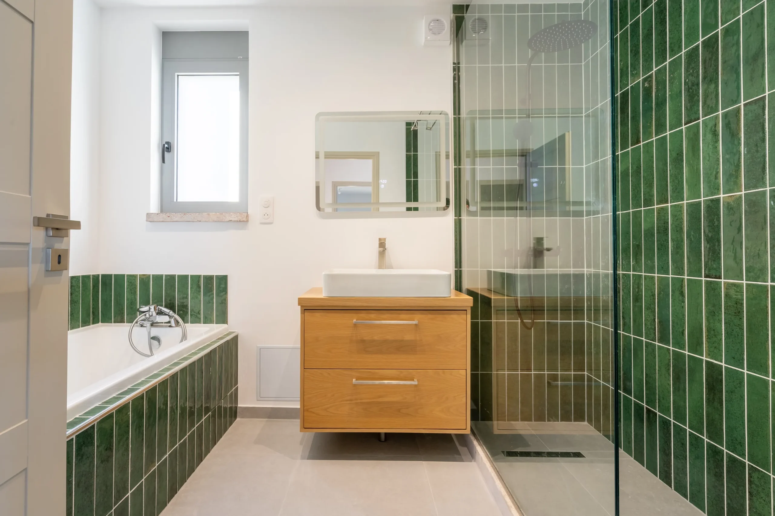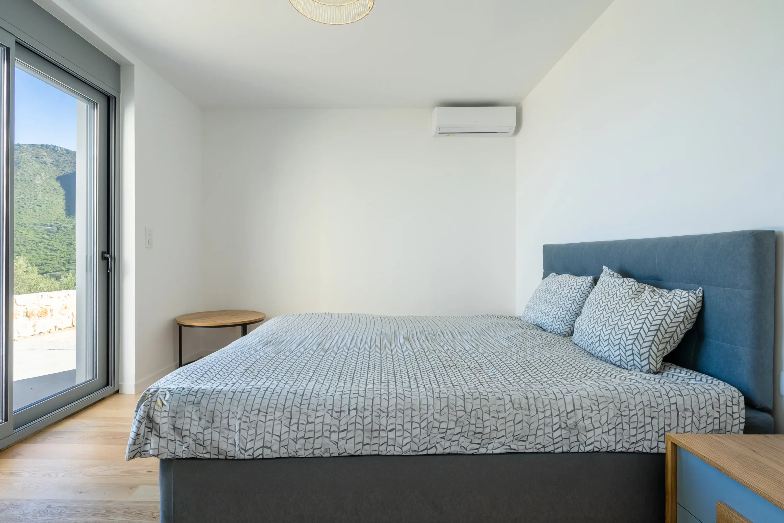 This sea view villa in Leonidio includes three bedrooms, among them a well positioned master suite, along with two WCs and a modern bathroom. The bathroom is finished with a walk in shower, glass partition, rainfall showerhead, and geometric tile detailing that complements the minimal aesthetic. The layout ensures privacy within the sleeping quarters while maintaining direct access to outdoor terraces and views.