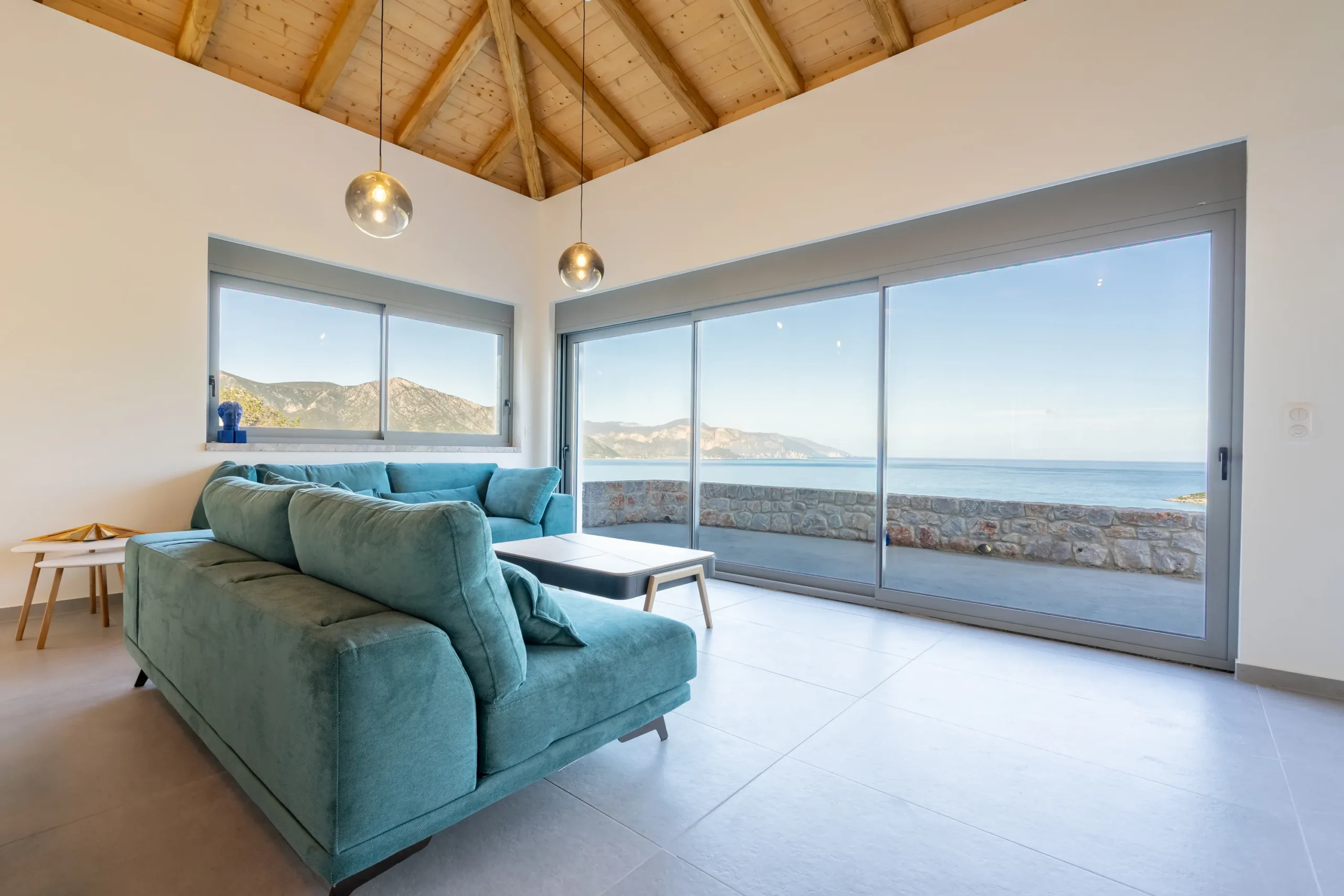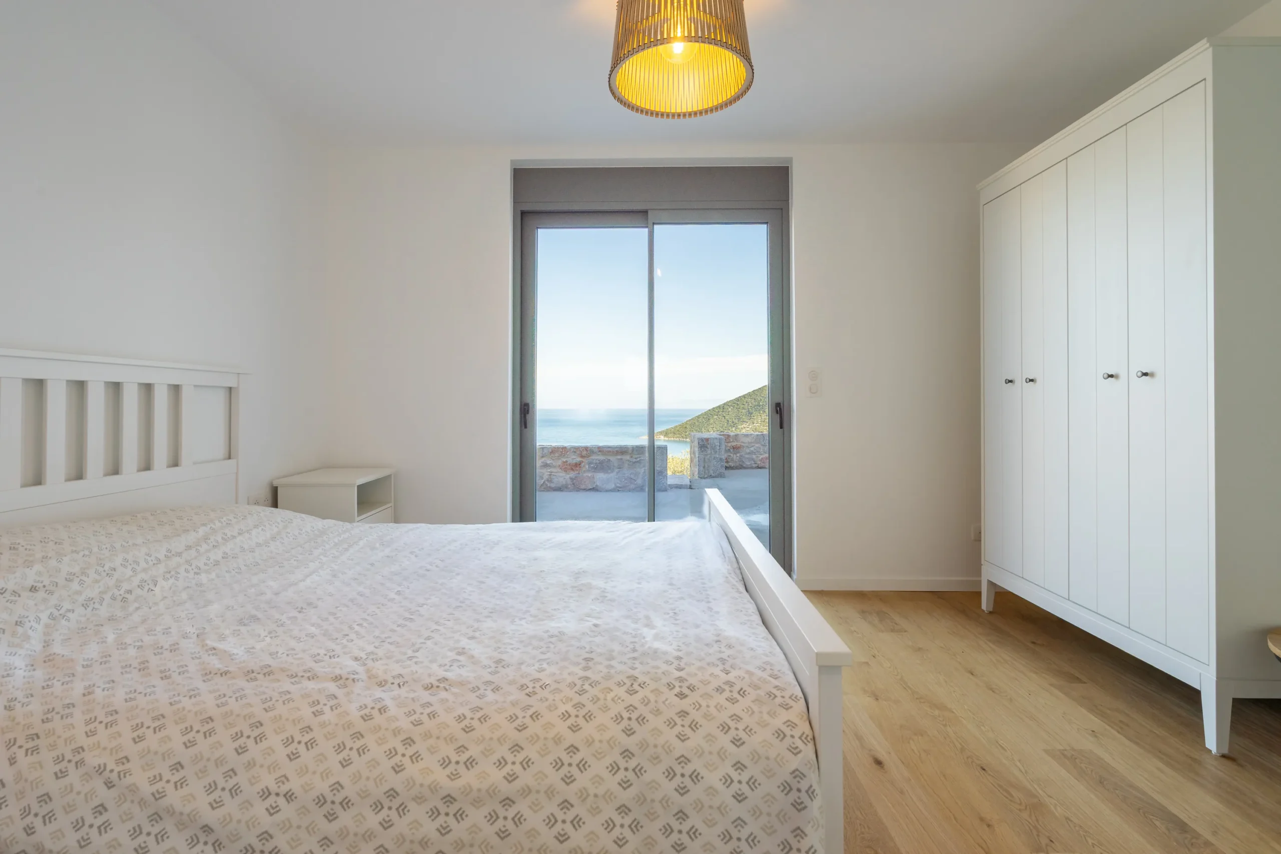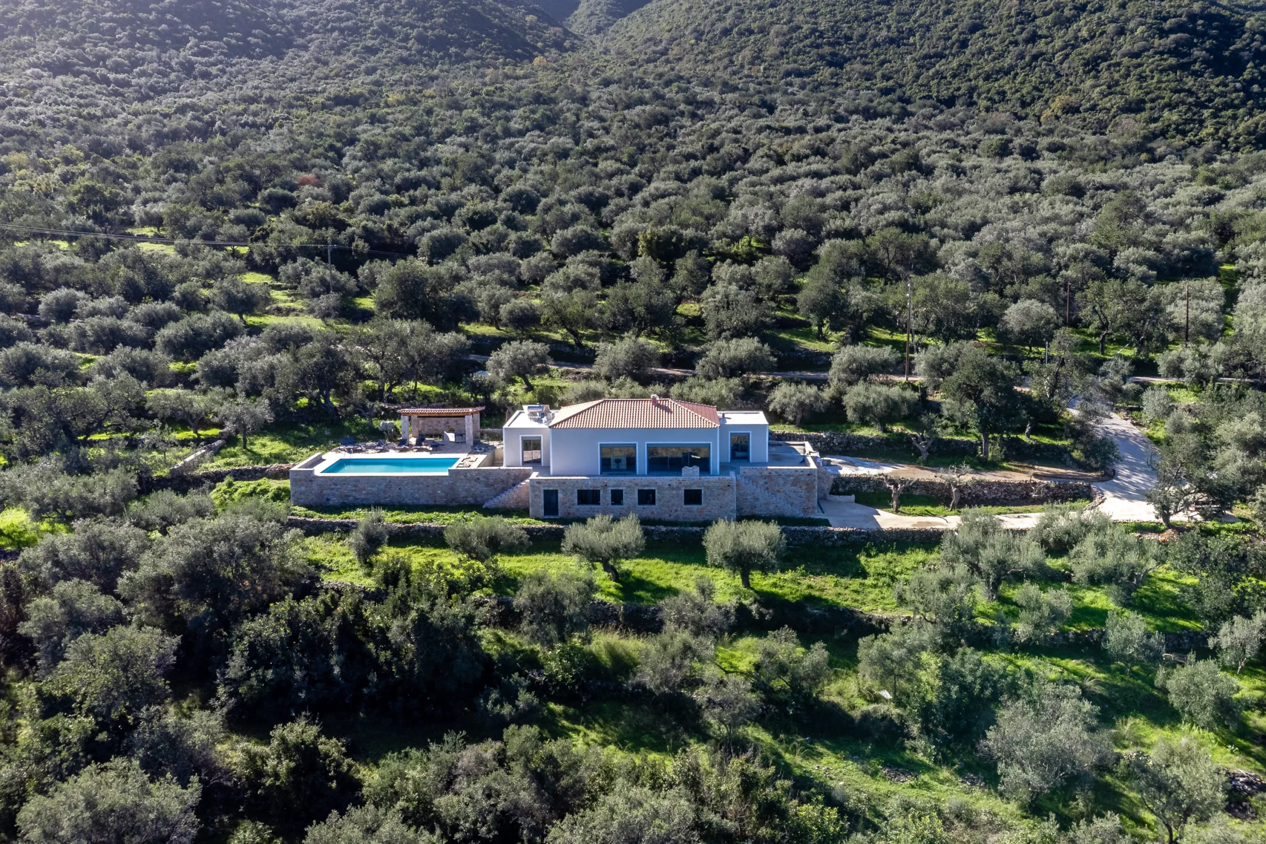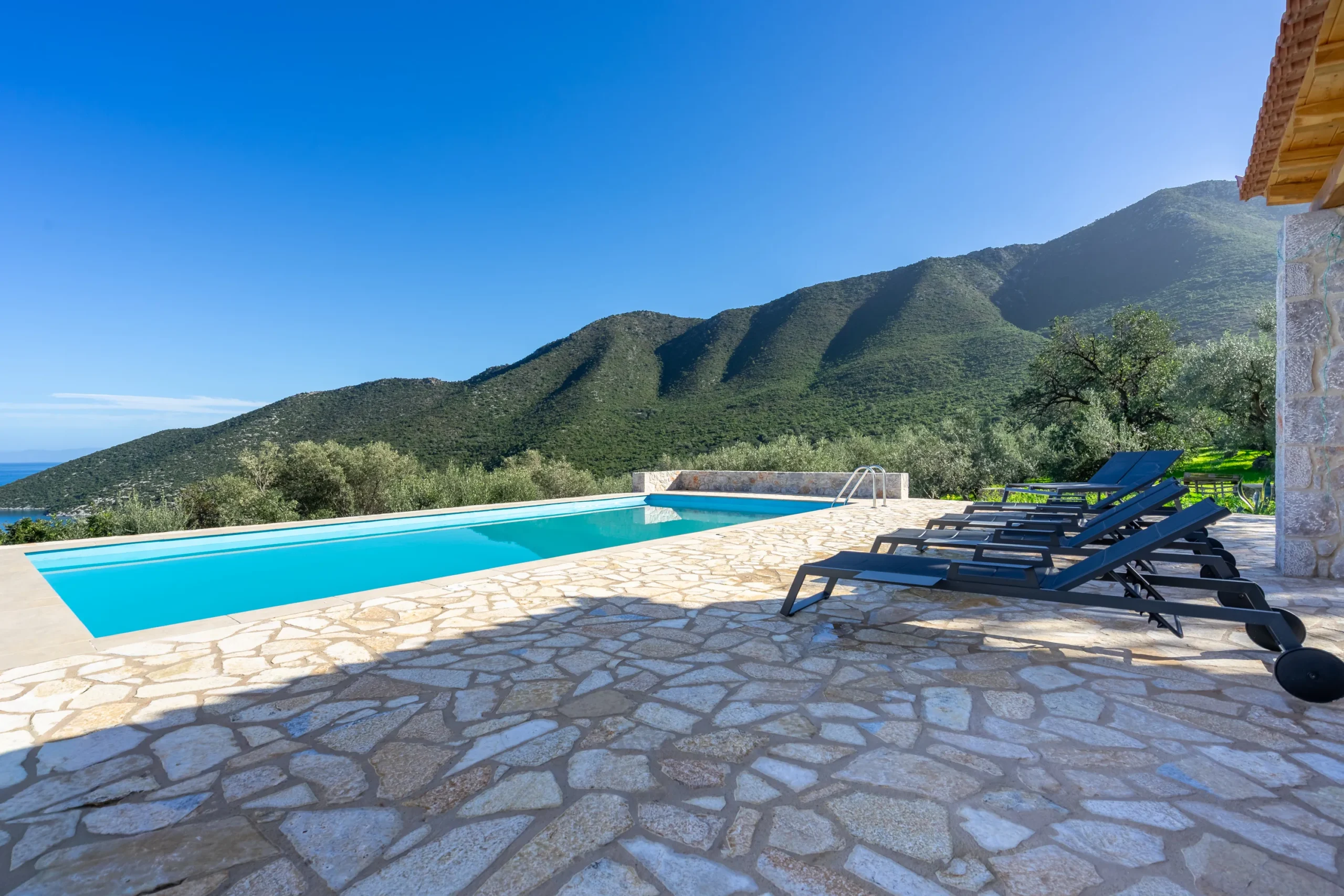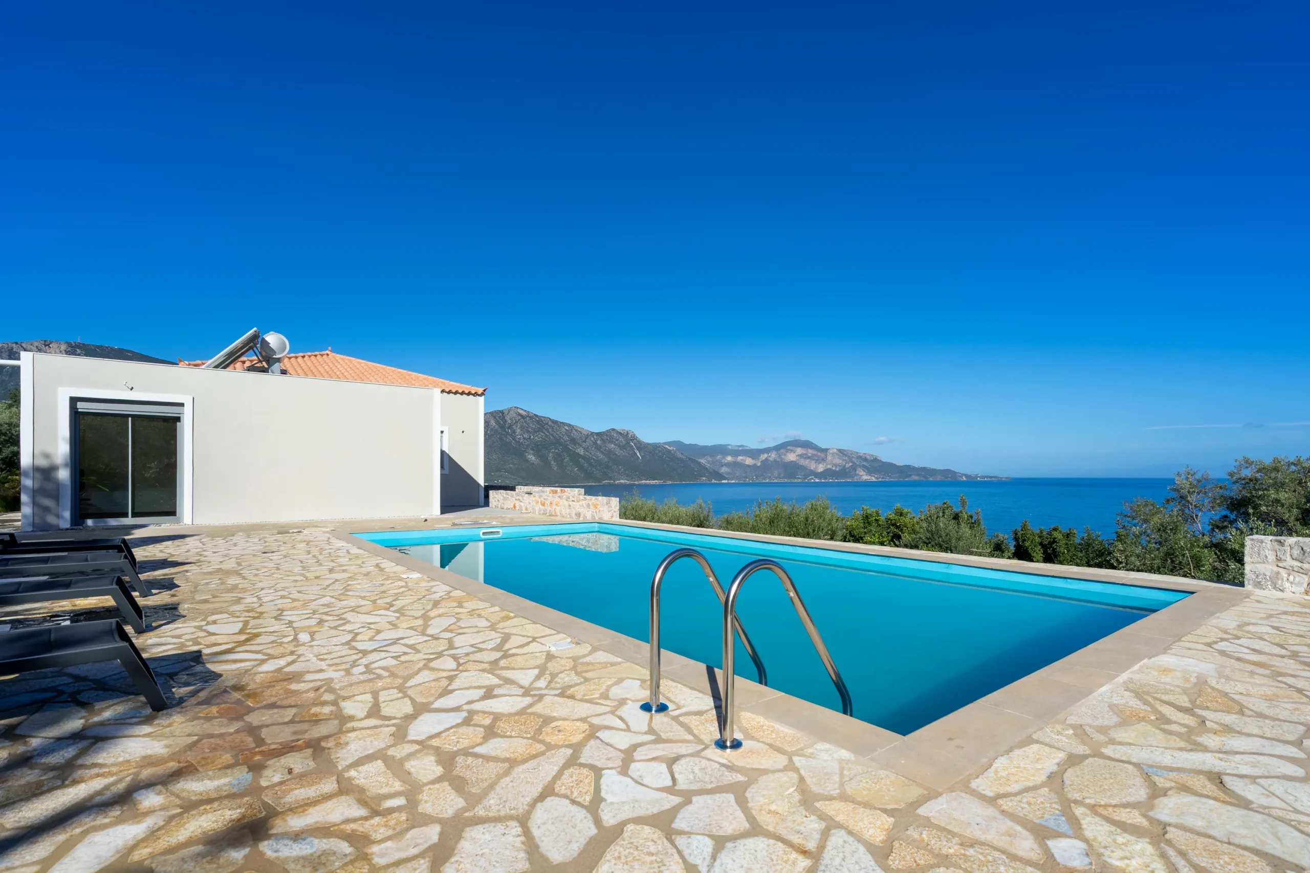 Externally, the residence transitions effortlessly into outdoor living. The swimming pool is positioned on a stone paved terrace with open views extending toward both the sea and surrounding mountains. The BBQ area is discreetly located behind the pool, preserving the clarity of the main terrace while remaining practical for hosting.