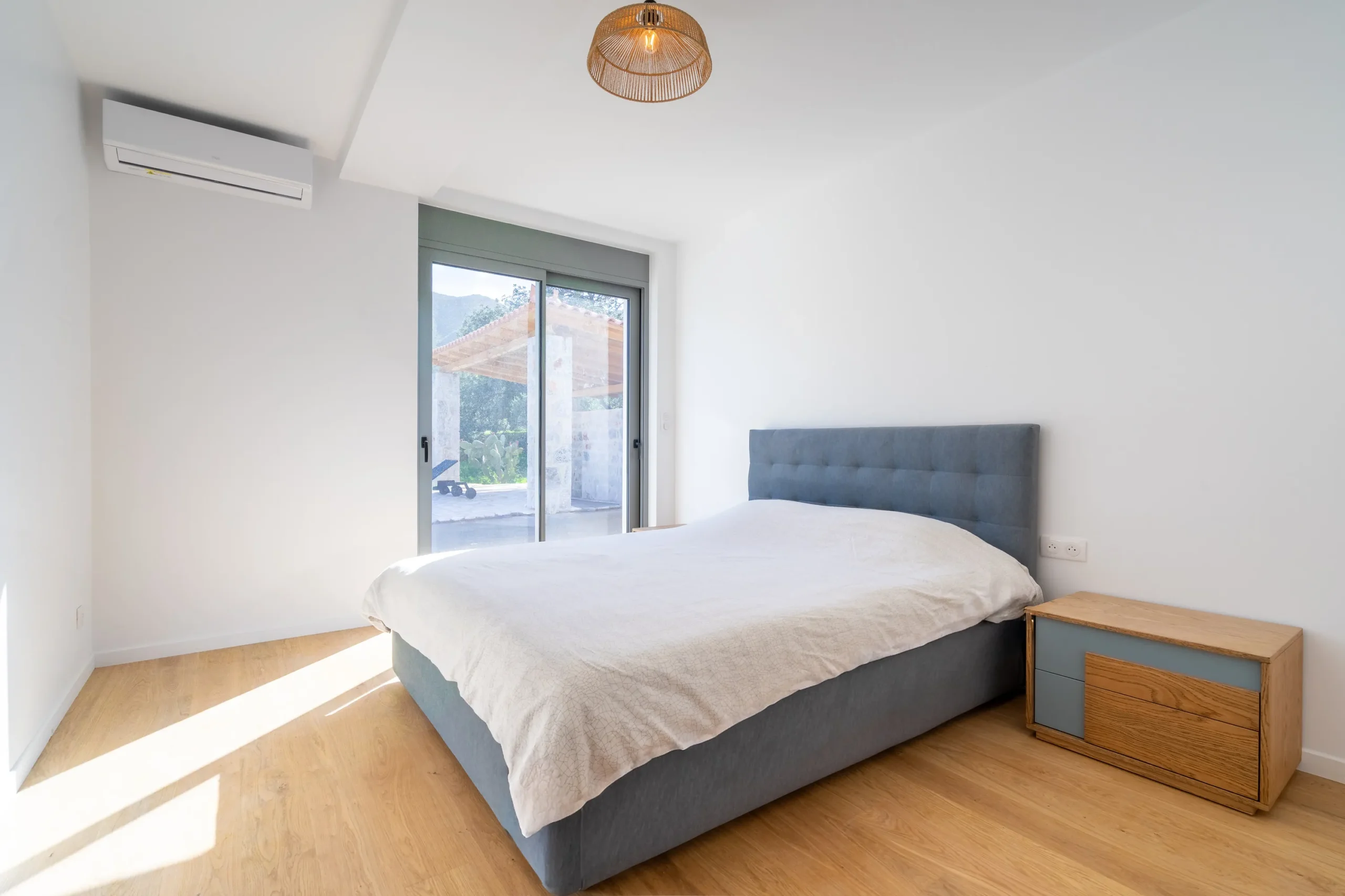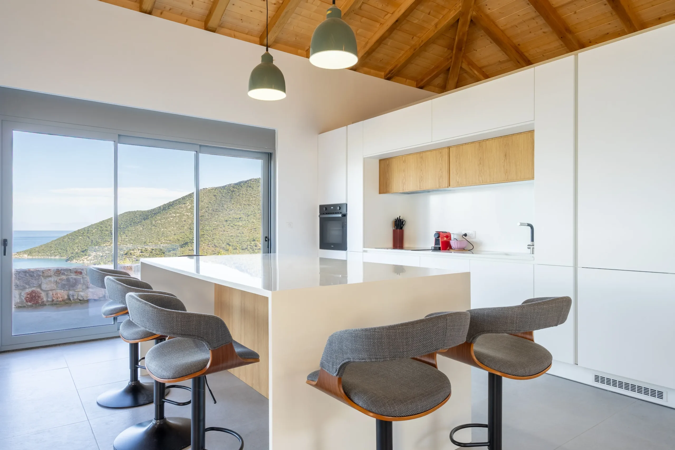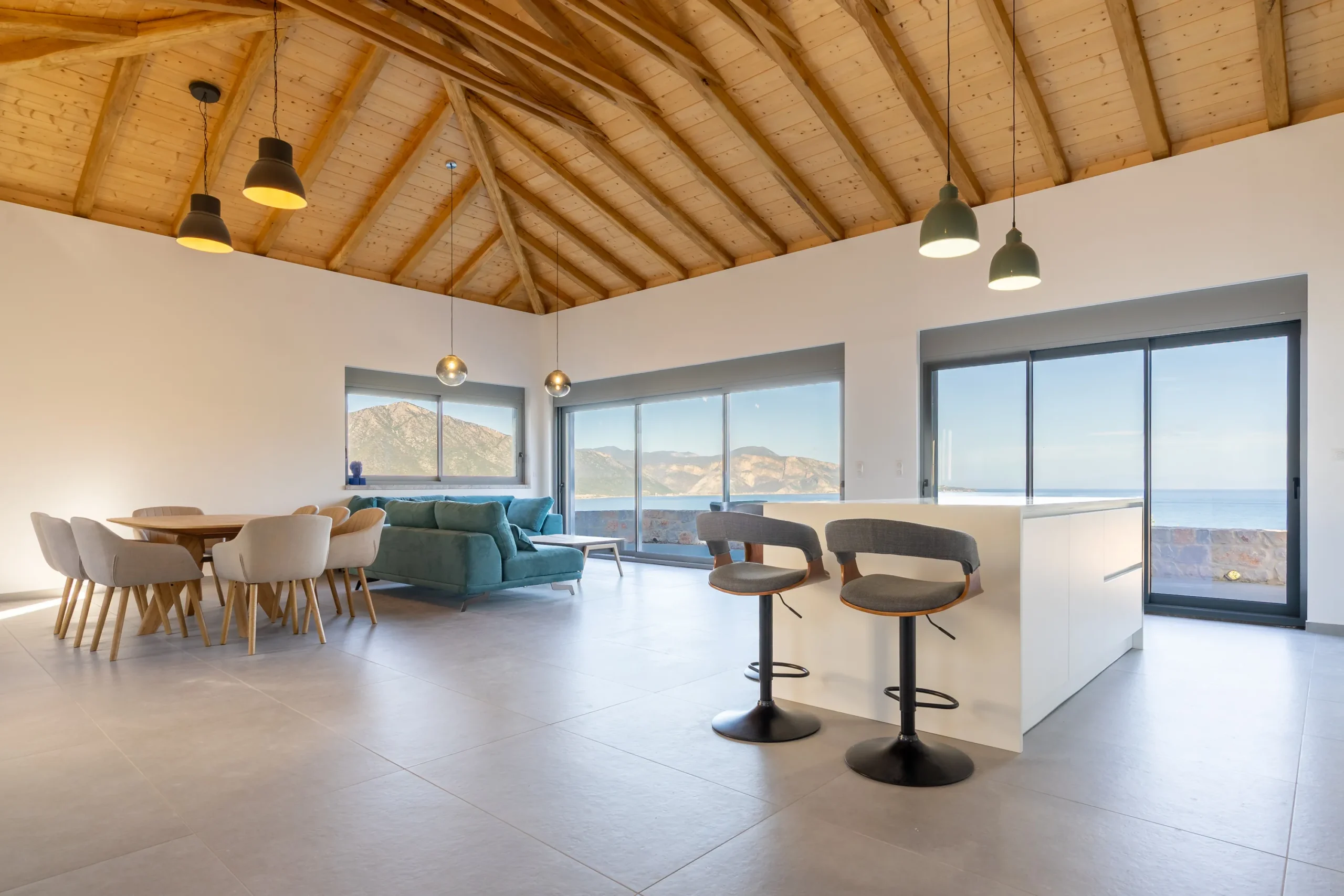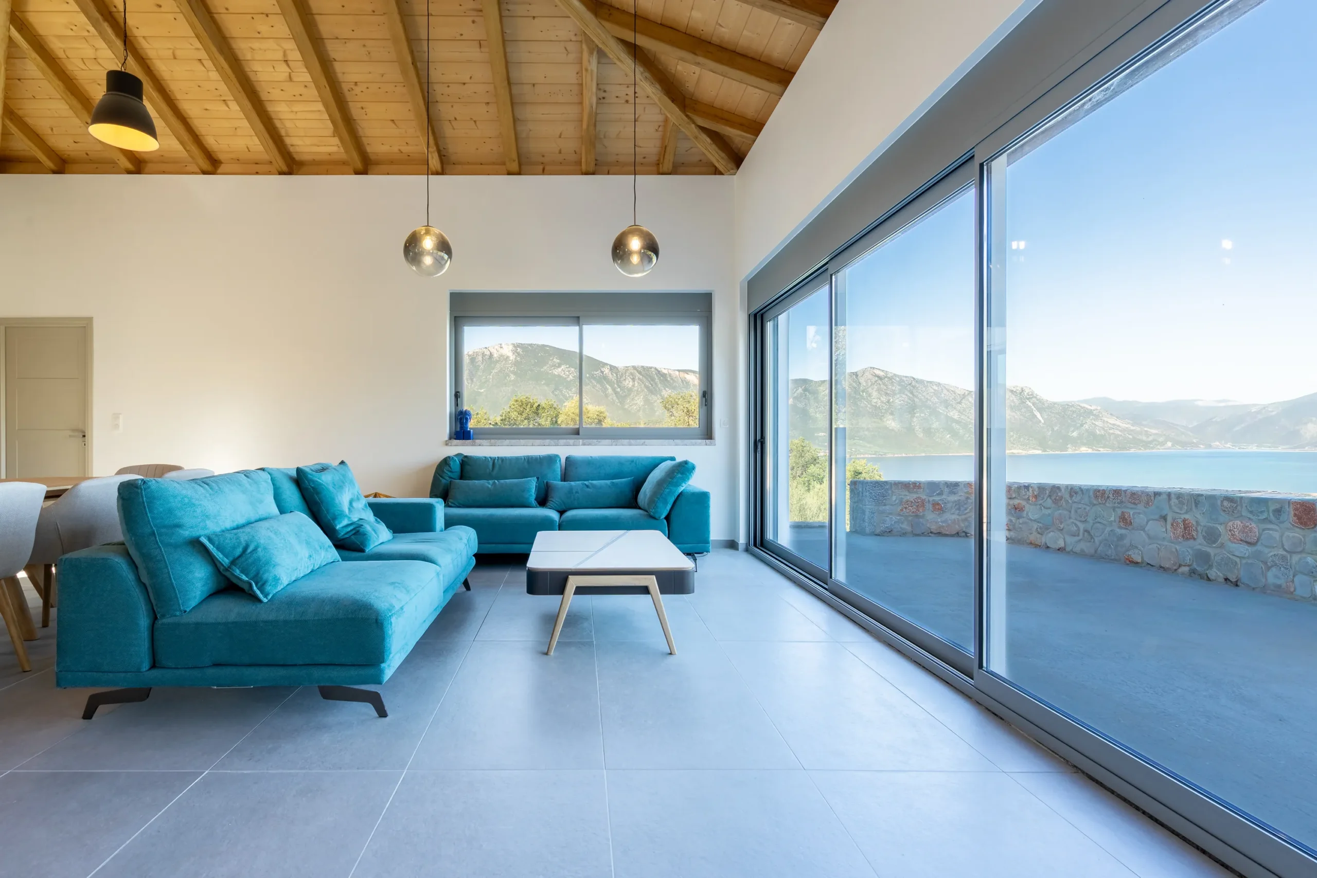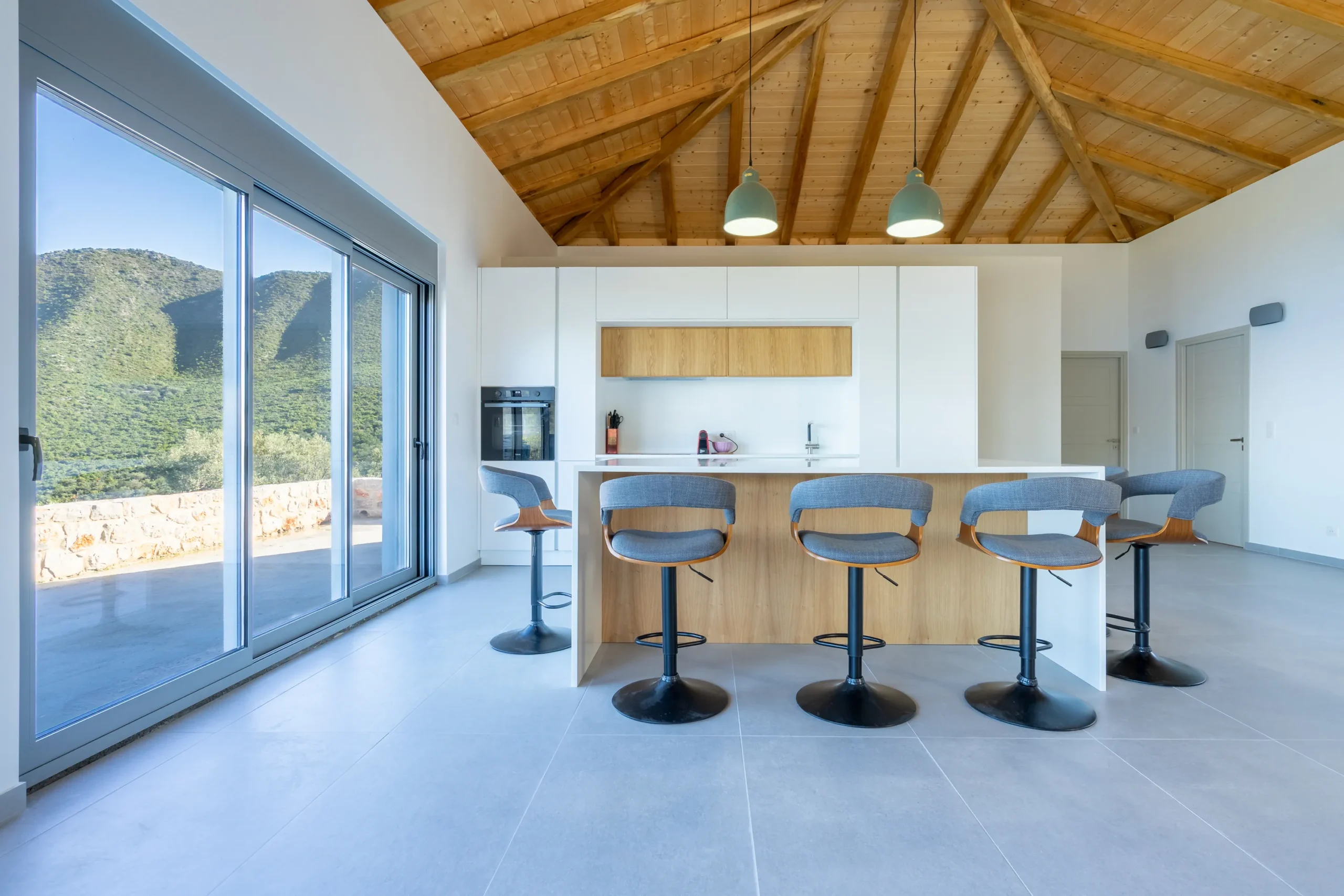 Externally, the residence transitions effortlessly into outdoor living. The swimming pool is positioned on a stone paved terrace with open views extending toward both the sea and surrounding mountains. The BBQ area is discreetly located behind the pool, preserving the clarity of the main terrace while remaining practical for hosting.