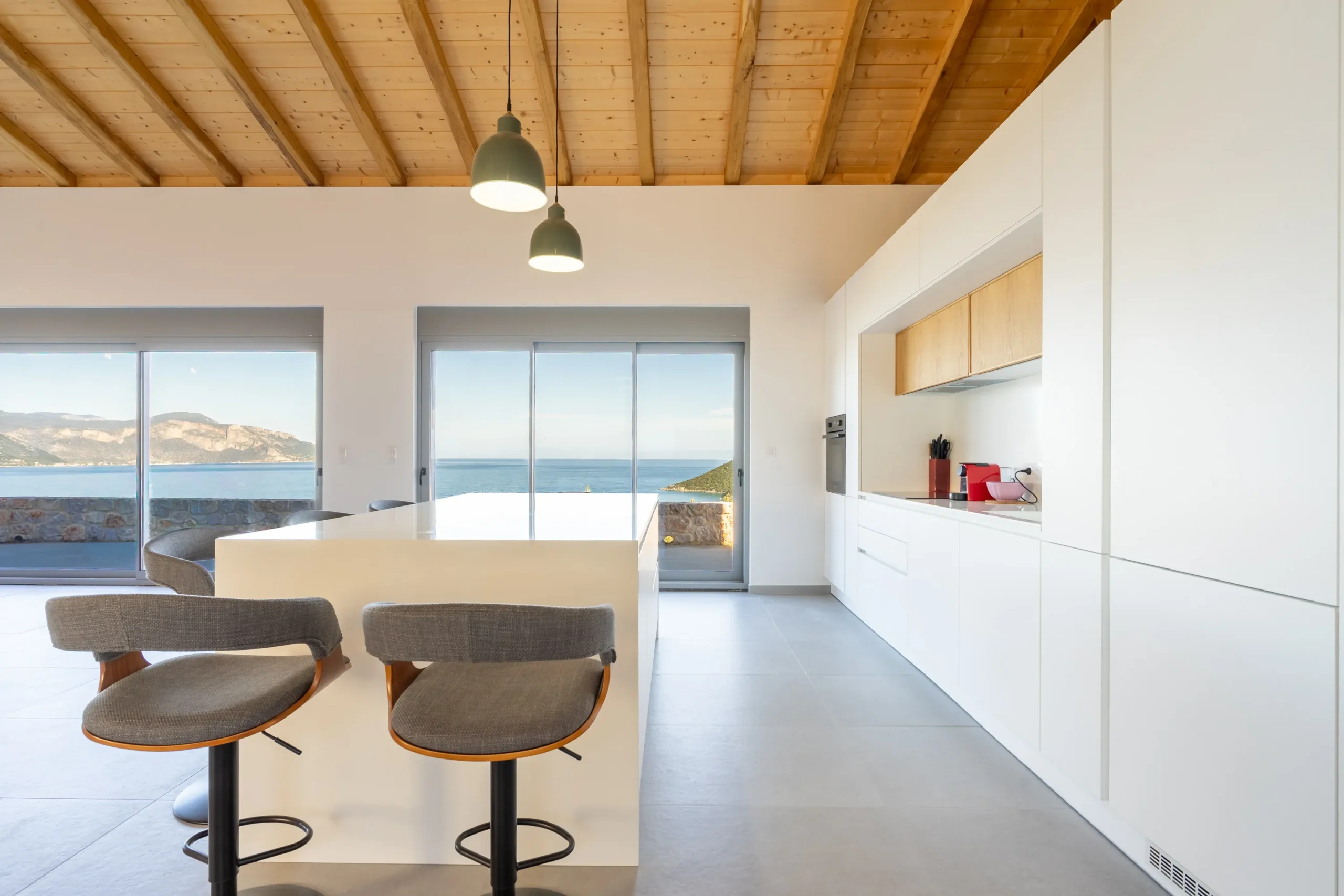 The main living area unfolds in an open plan configuration, where kitchen, dining, and lounge areas connect fluidly. Large glass openings frame the horizon, allowing natural light to move through the interiors throughout the day while reinforcing the strong visual connection to the sea. A timber ceiling introduces warmth and architectural depth, while a planned energy efficient fireplace will anchor the space during the cooler months.