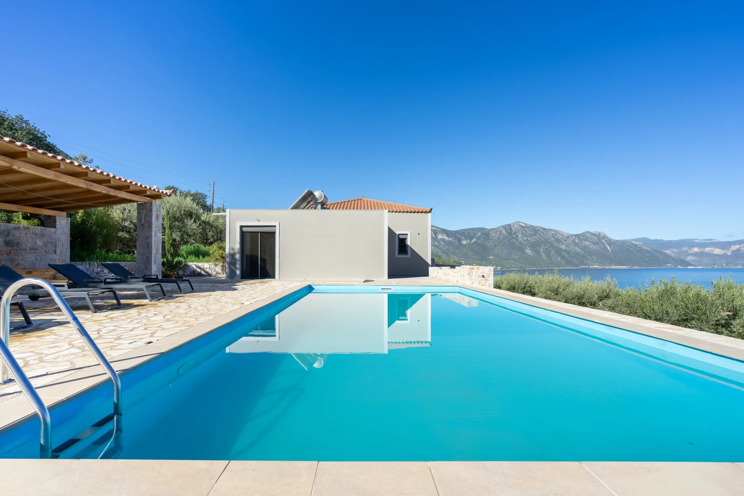 This sea view villa in Leonidio is positioned in the coastal area of Poulithra, enjoying unobstructed views across the Argolic Gulf and complete privacy within a generous natural setting.