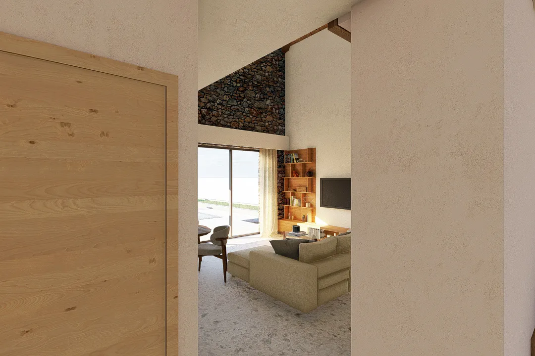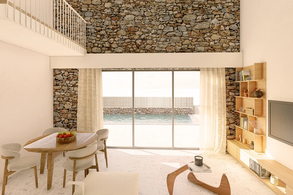The design combines clean modern lines with carefully selected stone accents that blend naturally into the surrounding landscape. Every space is planned for comfort and privacy, while energy-efficient systems provide eco-friendly living.