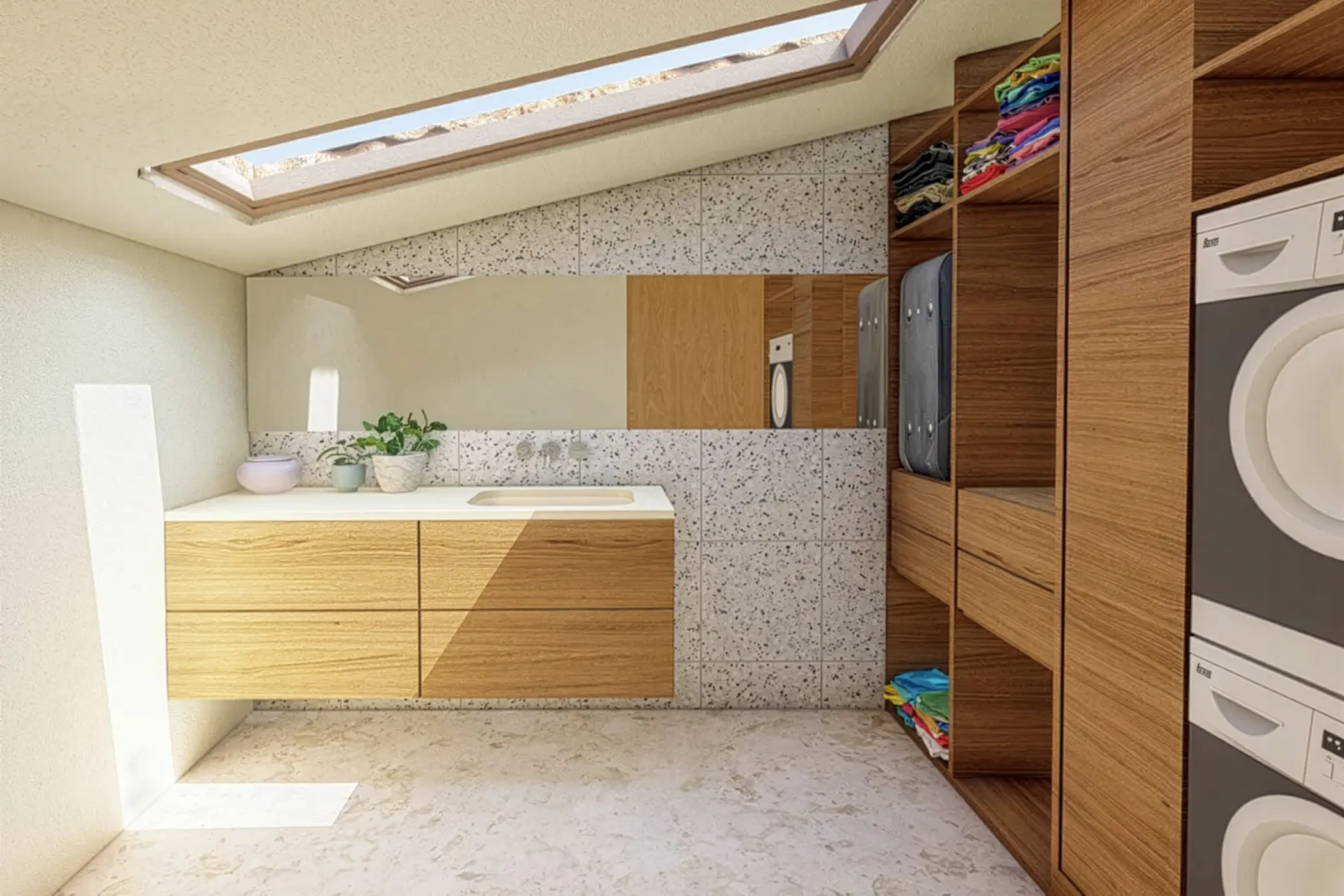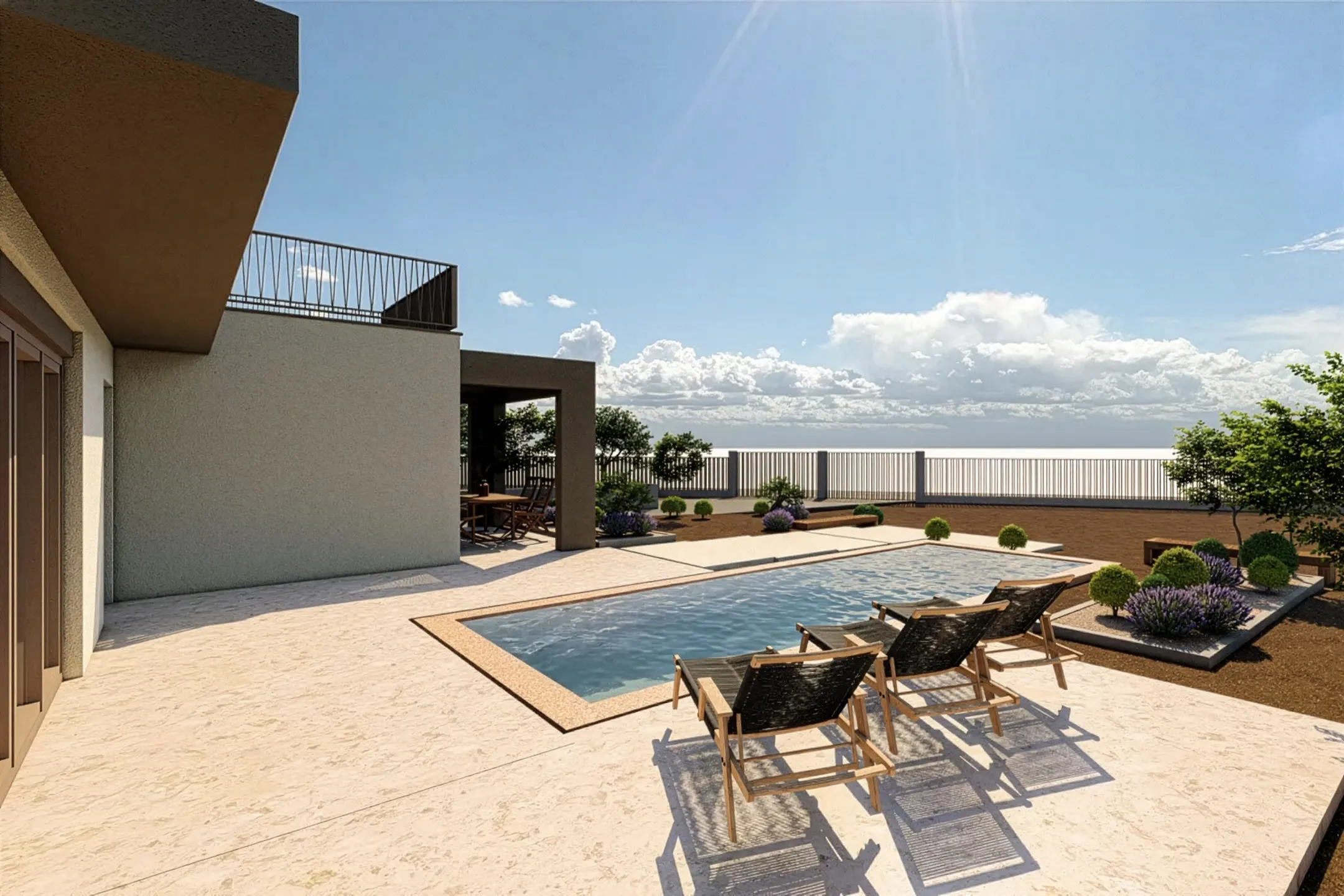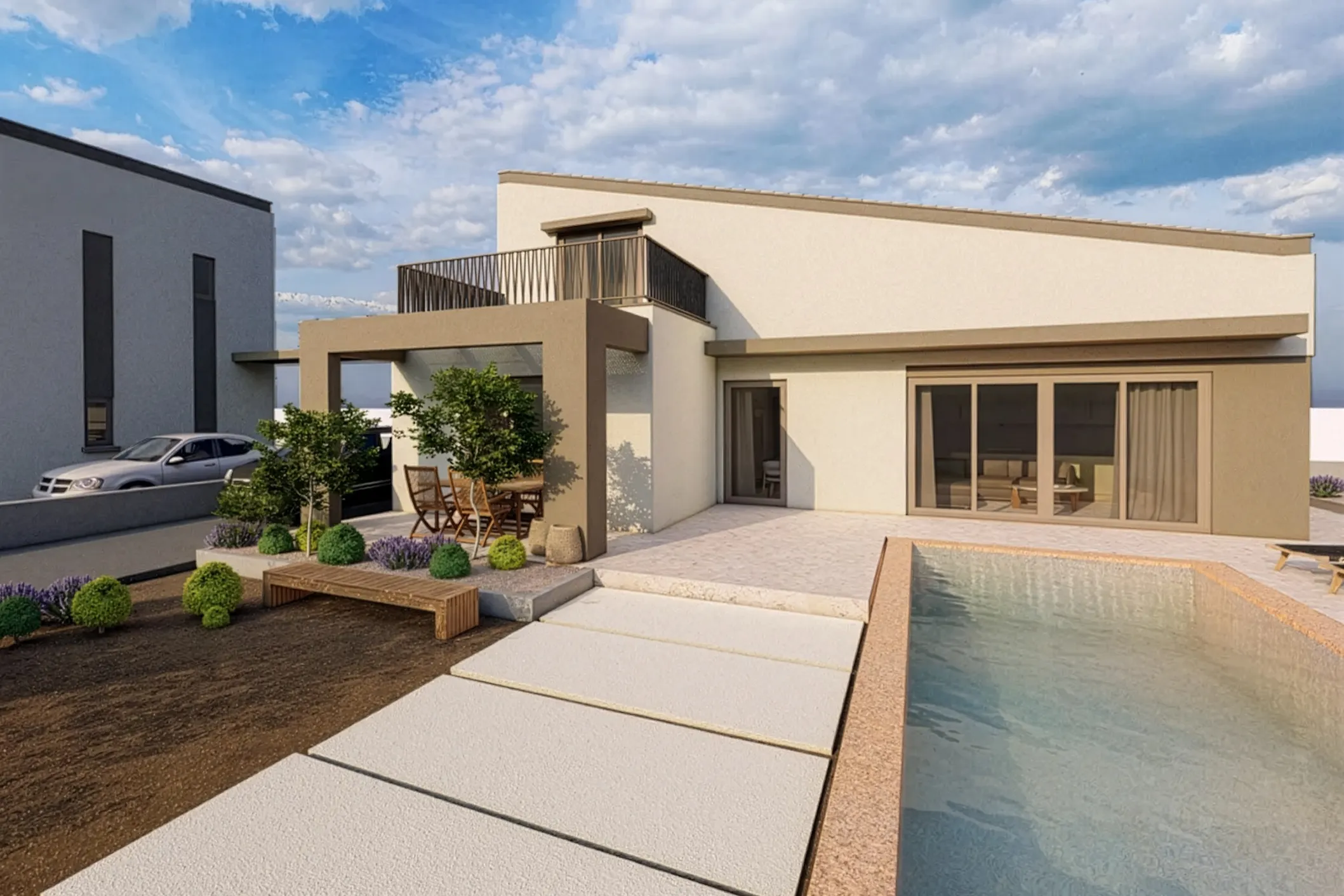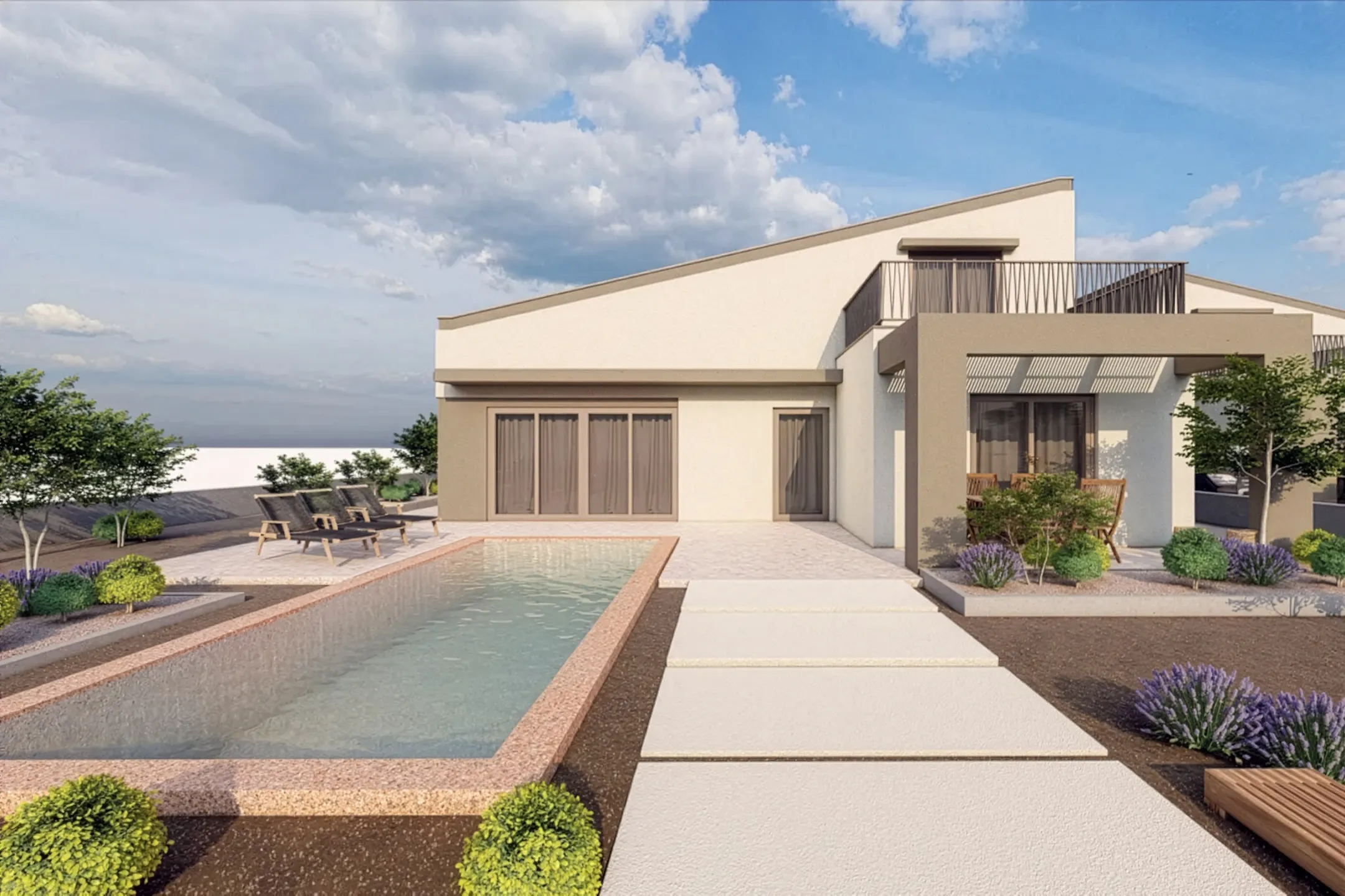 The villa features three well-proportioned bedrooms, offering calm and private spaces for rest and relaxation. The master bedroom includes its own en suite bathroom, while a second bathroom serves the rest of the residence. A dedicated storage room and private parking further enhance the practicality of the property, ensuring that functionality is seamlessly integrated into the design.