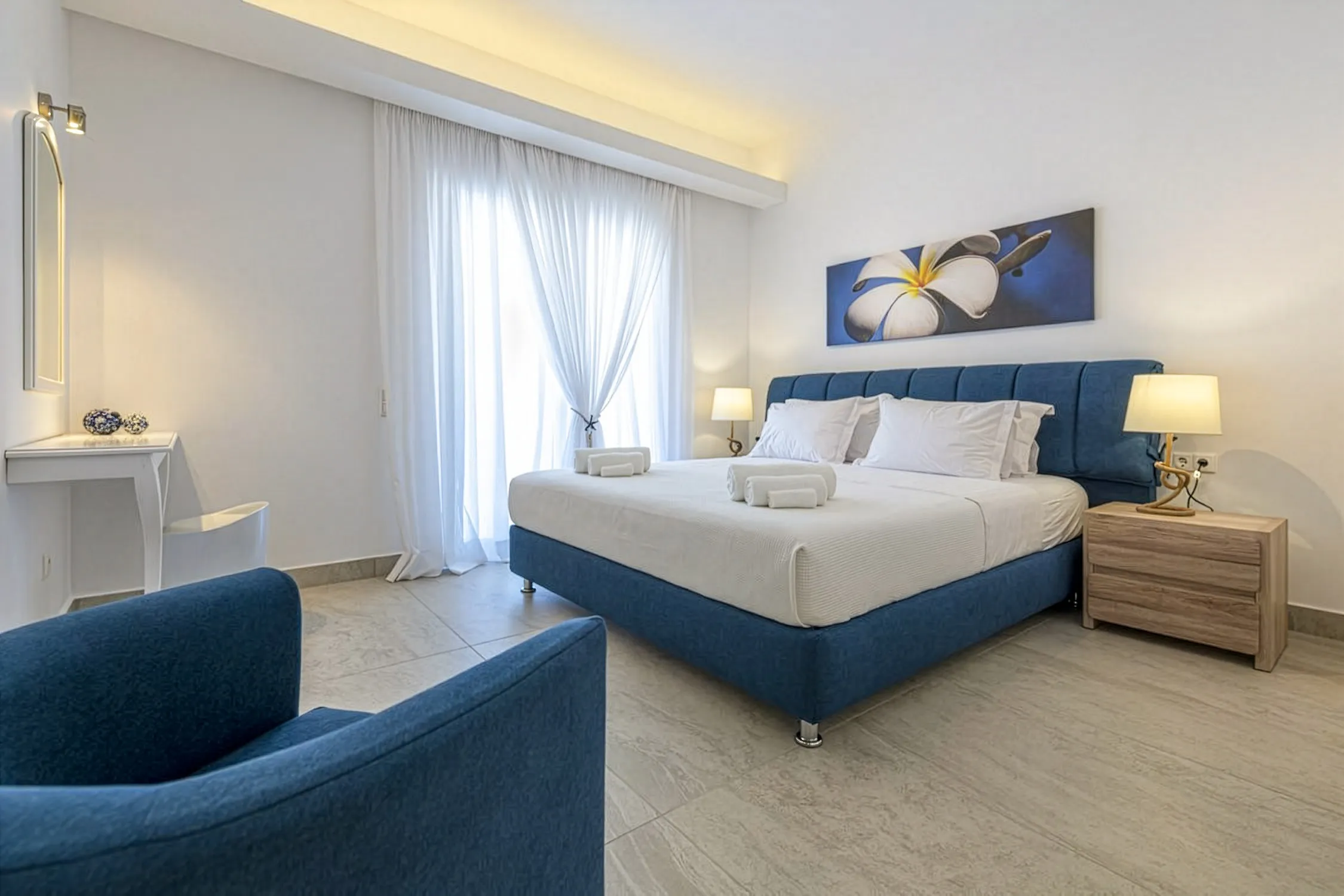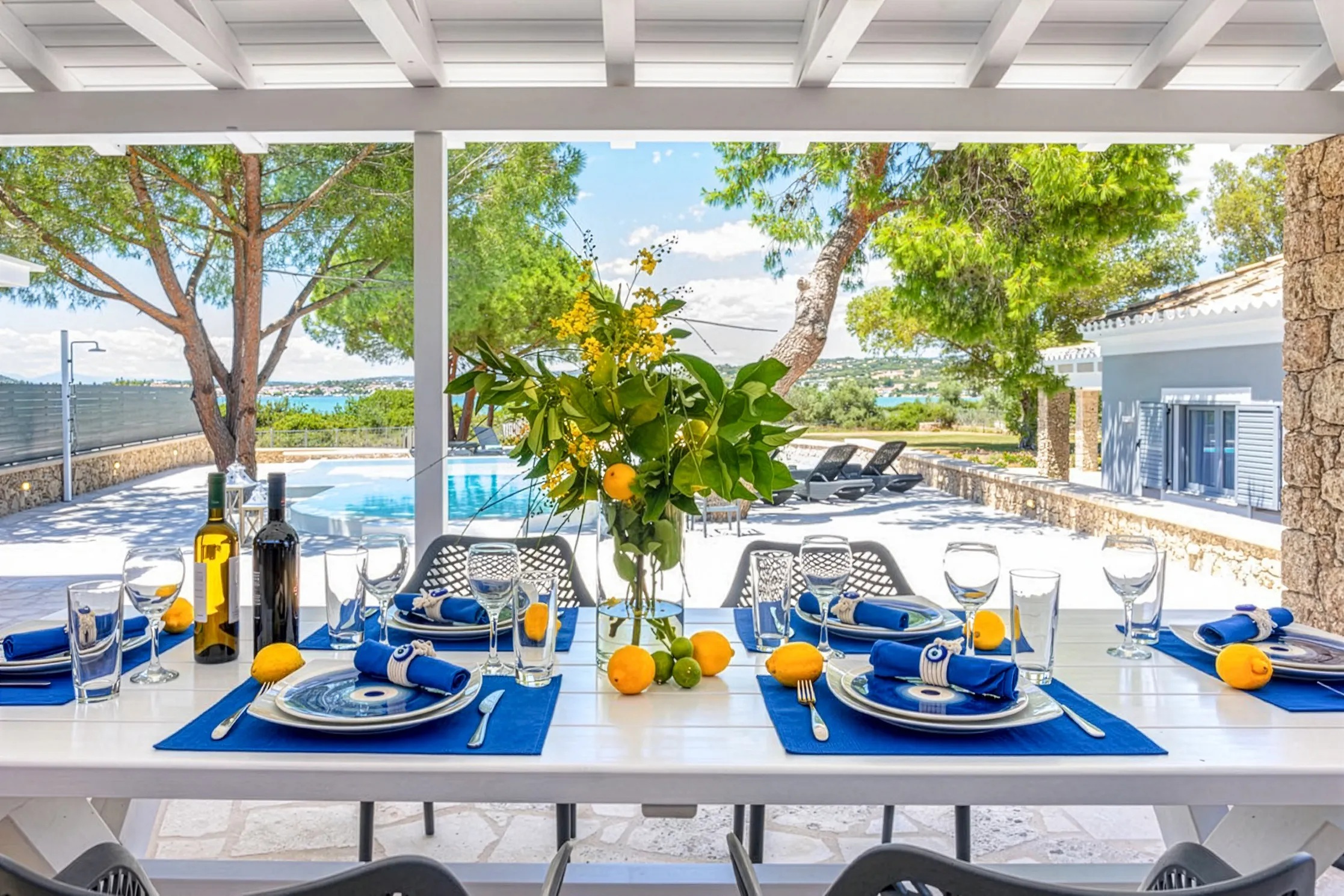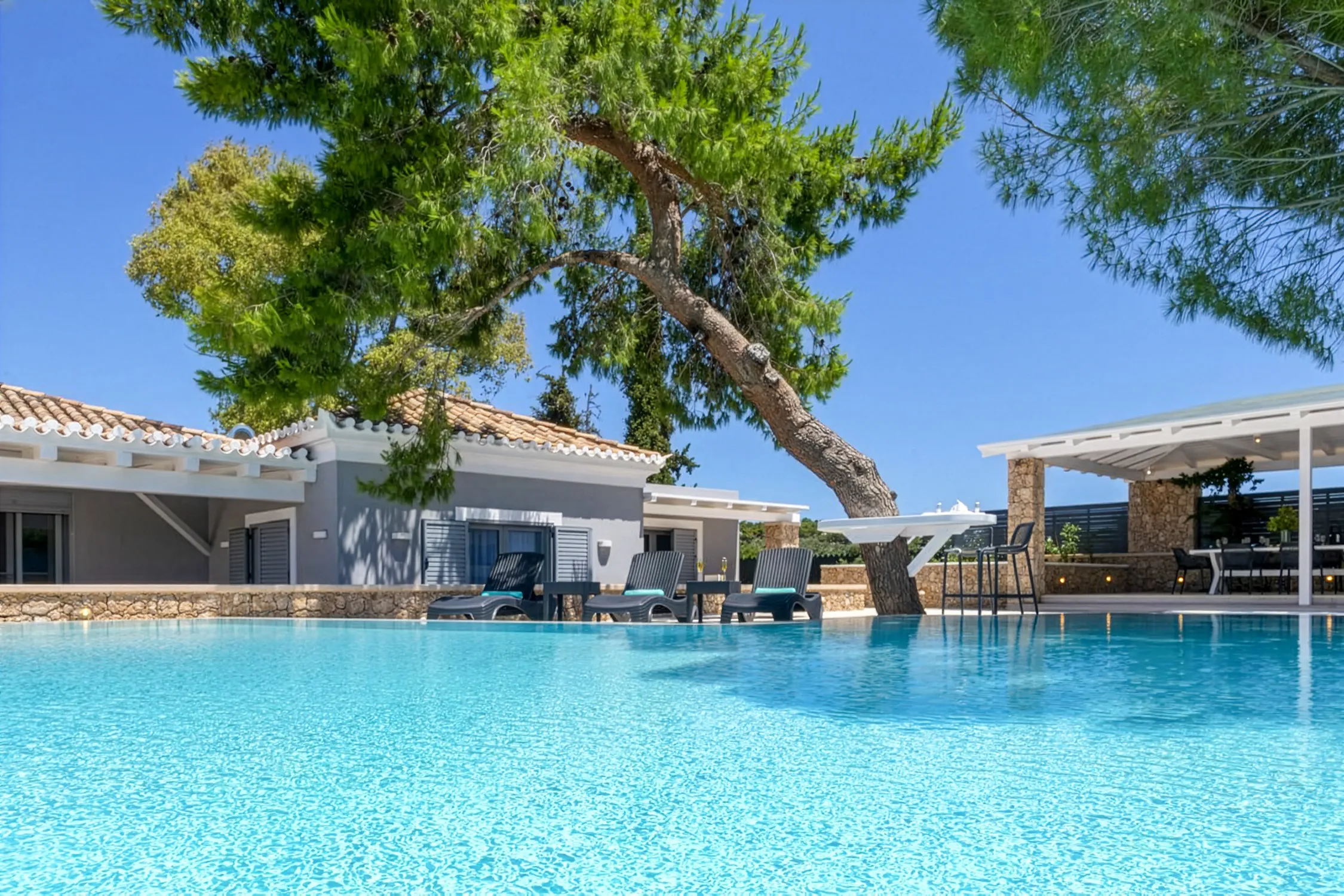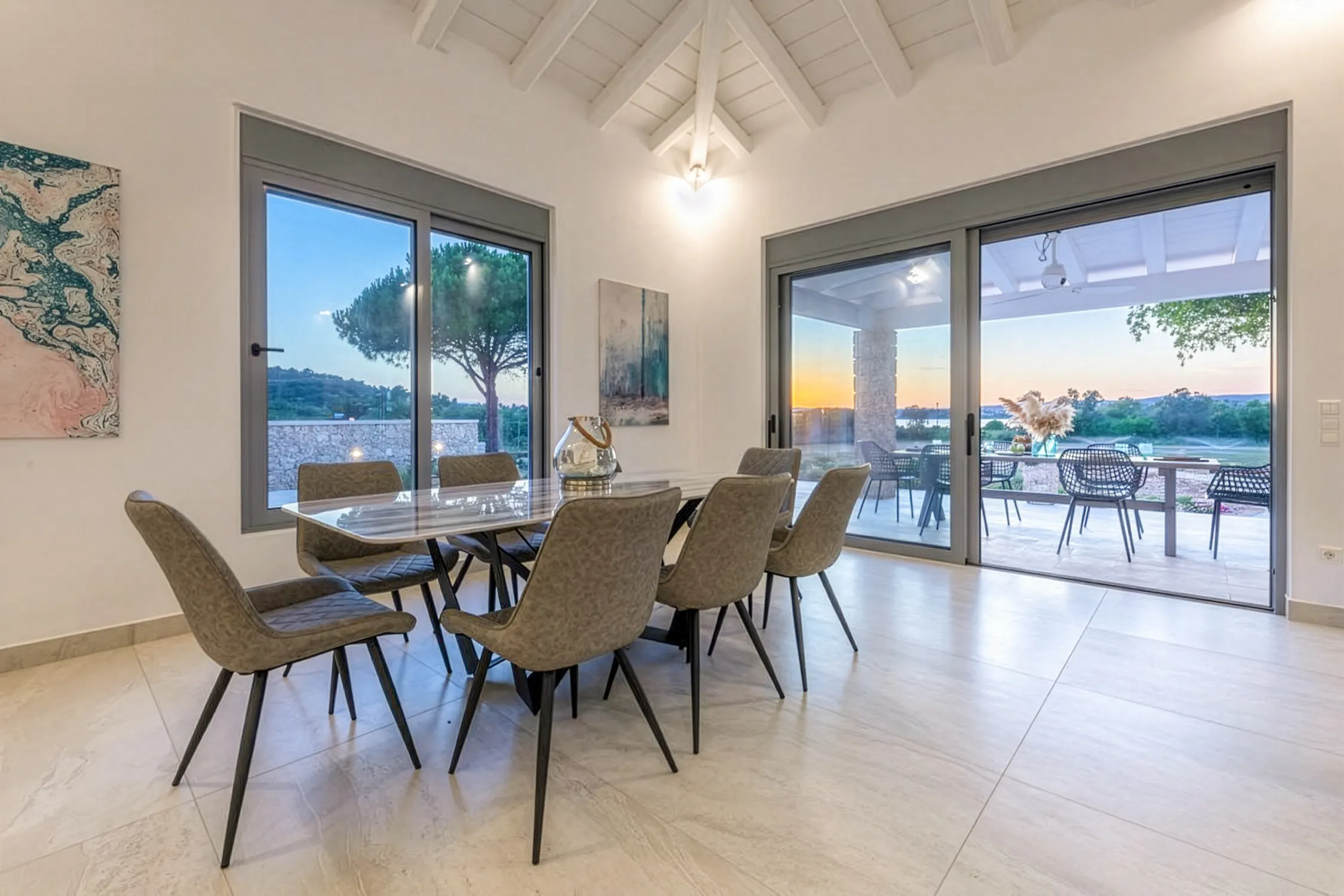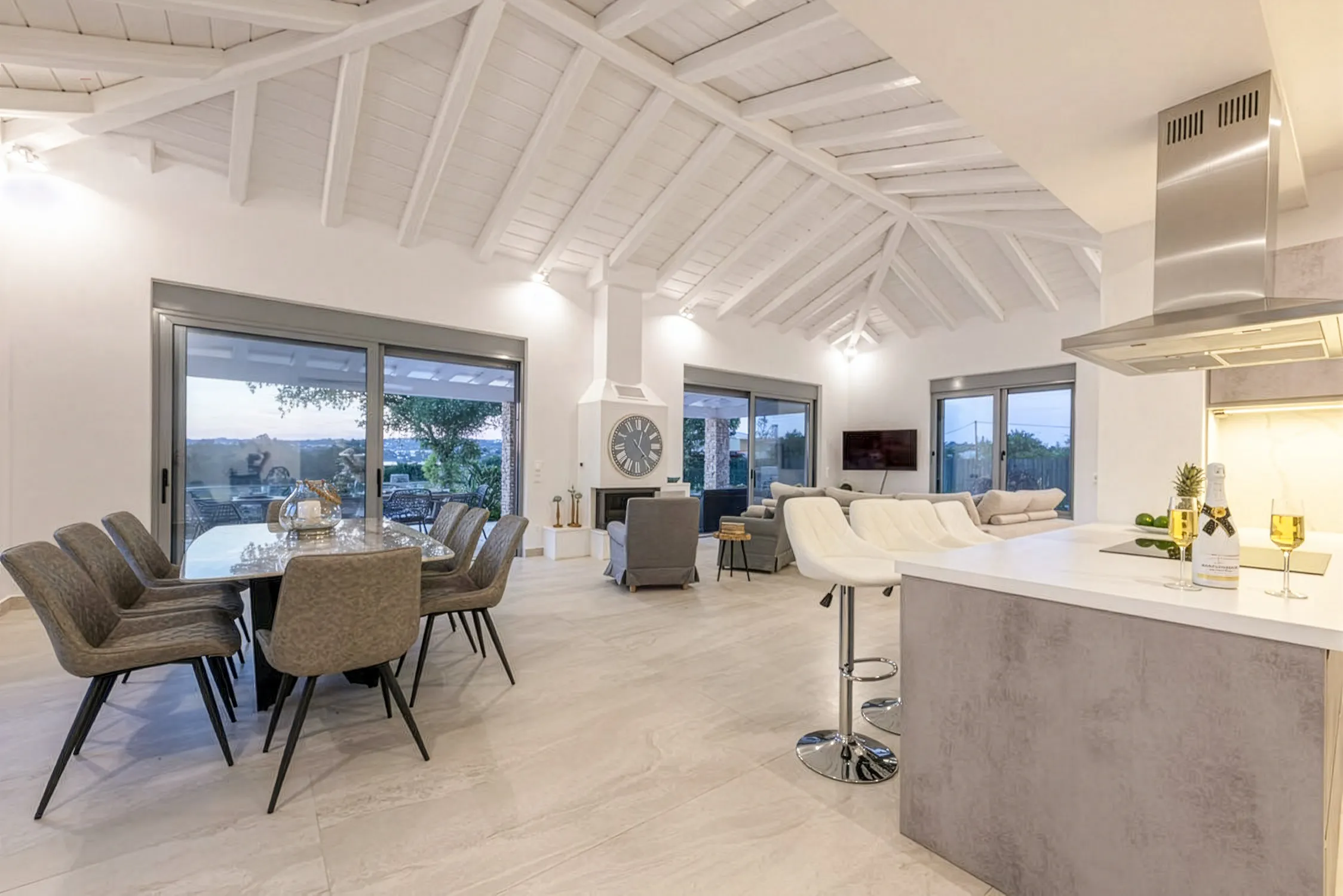 Large openings frame uninterrupted views of the sea and the Portocheli marina, allowing natural light and coastal breezes to fill every room. The open plan kitchen, living, and dining areas connect effortlessly to the landscaped gardens, infinity pool, and pool bar, turning the outdoors into a natural extension of the villa.