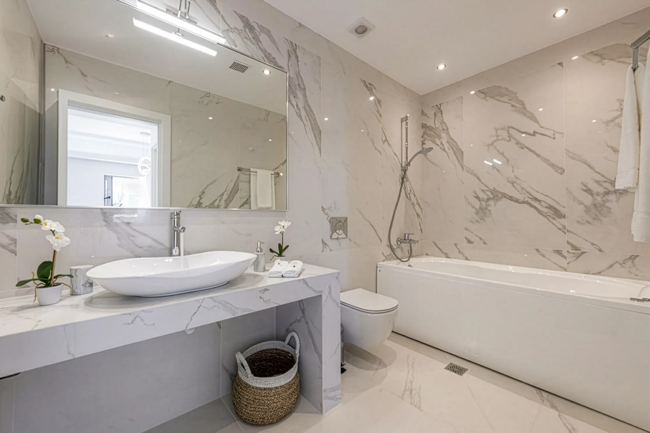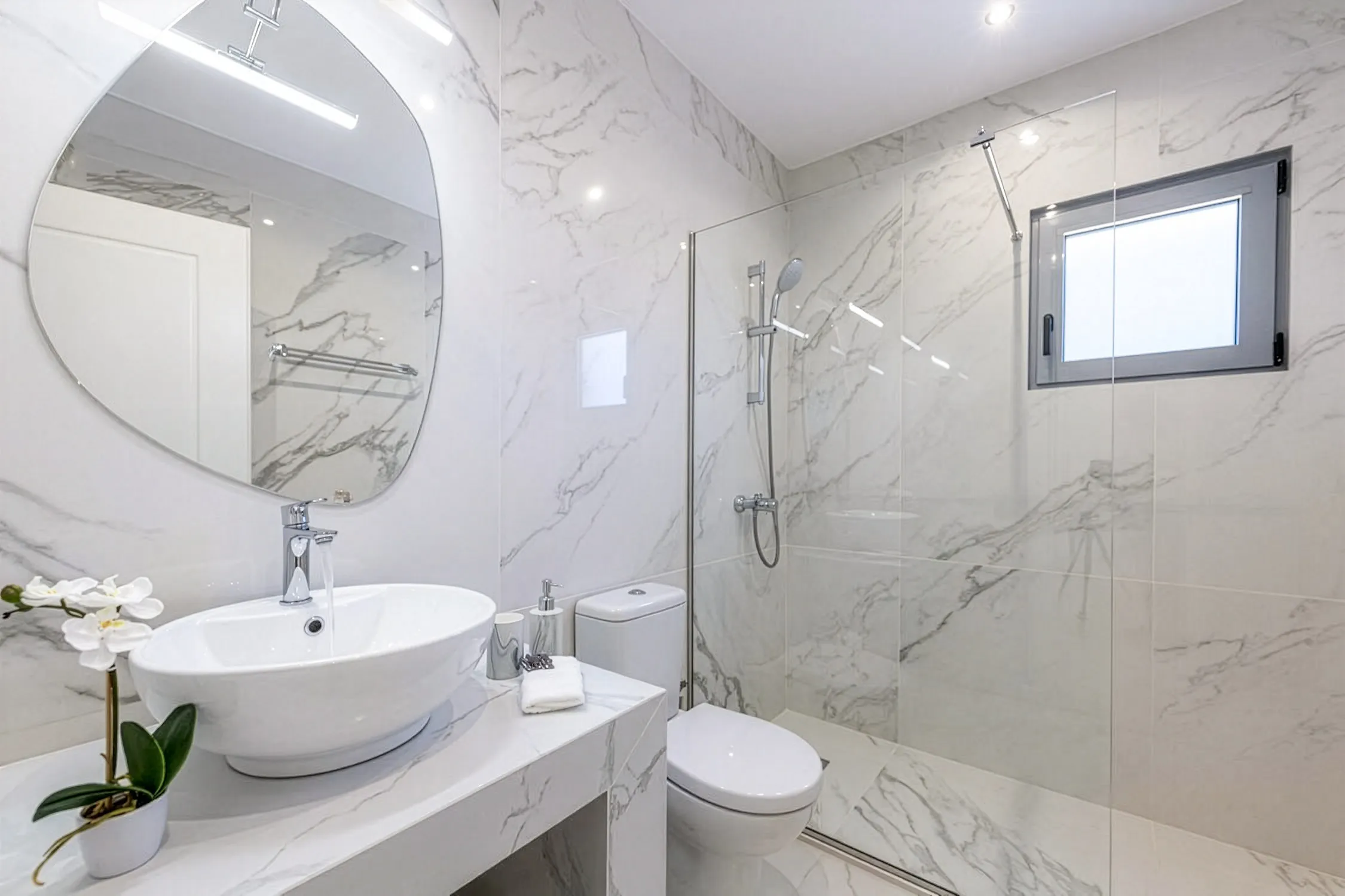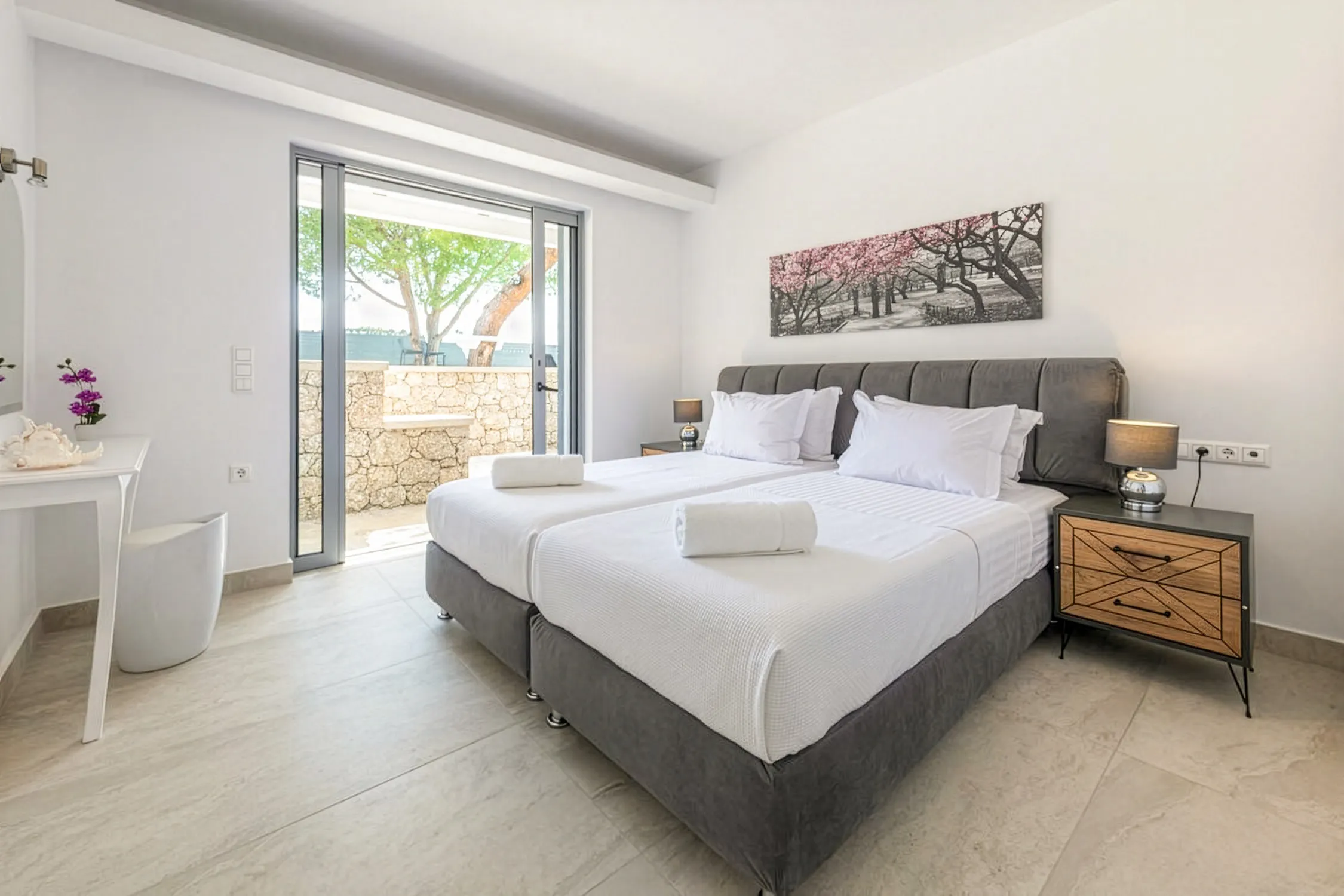 The villa’s five bedrooms provide privacy and convenience, each with spacious wardrobes and en-suite bathrooms. A separate guest house with independent access from the pool area ensures autonomy for visitors. Expansive openings to the outdoors frame breathtaking views of the sea and Portocheli marina, while the garden, infinity pool, and pool bar transform the exterior spaces into an extension of the villa’s living areas.