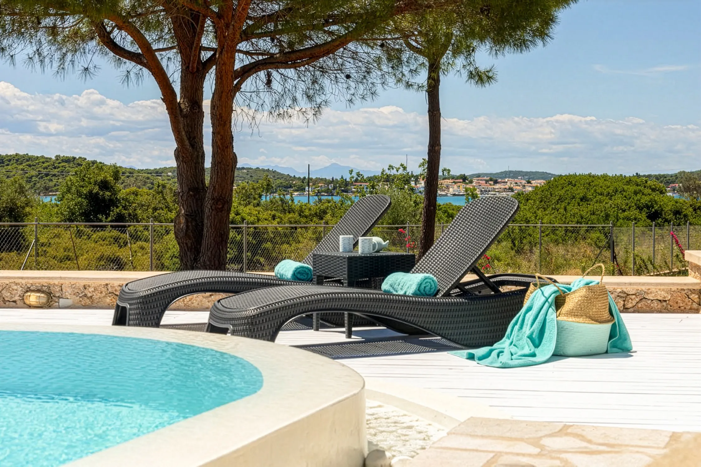 The surrounding 4,500 sqm plot is thoughtfully landscaped, combining functionality with modern aesthetics. Trees, orientation, and gentle slopes create a pleasant microclimate and cooling shade for outdoor areas. From its elevated position, the Villa in Porto Cheli by the Sea captures panoramic views that transform the infinity pool and terrace into cinematic experiences.